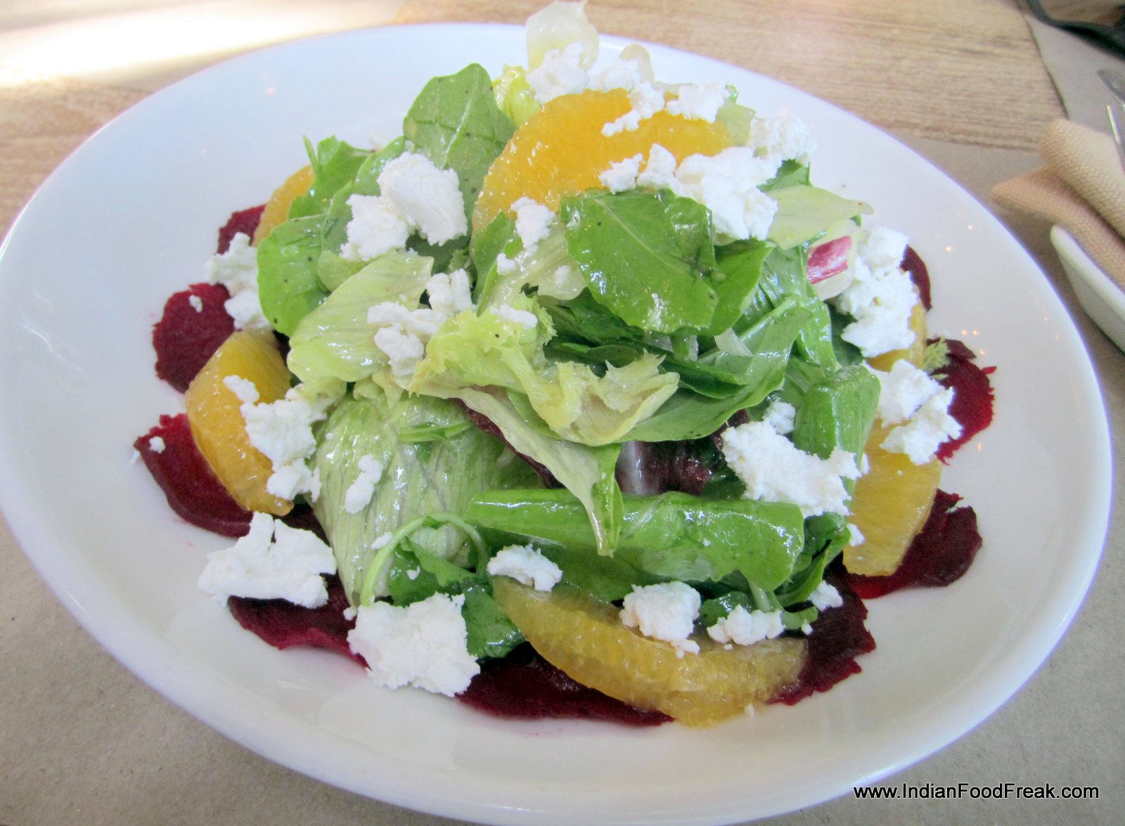 It is not easy to find good French onion soup in NCR but the one here (Rs 245) is an exception, being both authentic and delicious. Vegetraian dolmathes (Rs 345) are tomato seasoned rice rolled vine leaves, with Greek curd dressing, and caramelised orange. For a change this Greek classic is served warm and cheesy, and is a delight to eat. Beets, Orange and Goat Cheese salad (Rs 345) with roasted beet, orange segment combined with assorted greens, French goat cheese, and raspberry vinaigrette is a wonderful summery salad.