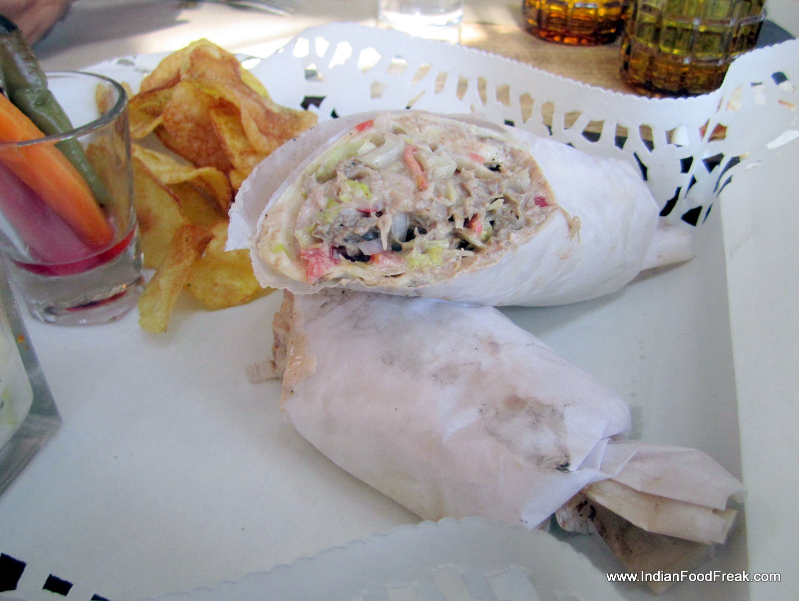 Mille Fuille, Smoked Scamorza Greens Gratin (Rs 495) a vegetarian dish with broccoli, asparagus, green peas, green onion  tossed with roast cumin and Spanish paprika, smoked scamorza gratinated; celery, pumpkin and buttermilk velouté, and drizzled with pesto oil is a classic case of recipe overload. The rich mille fuille with pumpkin and topped with pesto oil makes for an oily, heavy bite.  Pulled Pork Meat Shawarma (Rs 375) has spice marinated pulled pork meat combined with, red onion, tomato, gherkin, and jalapeno in a pita pocket. However the pulled pork has no texture and is more like a mash making it a not very alluring dish. The blueberry cheesecake (Rs 295) is ordinary.