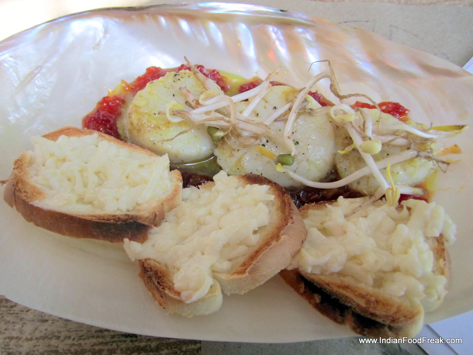 On top of my list of favourites, and the absolute hero of the tasting session is sea scallops (Rs 545), which has perfectly cooked curry infused butter roast scallops, sweet chilly jam, and young cheddar cheese toast. The composition is a perfect harmony of flavours and textures. The sweet, plump and juicy scallops go perfectly with the tart sweet chilly jam and the crisp cheesy toastlets. It is my wow moment of the day.