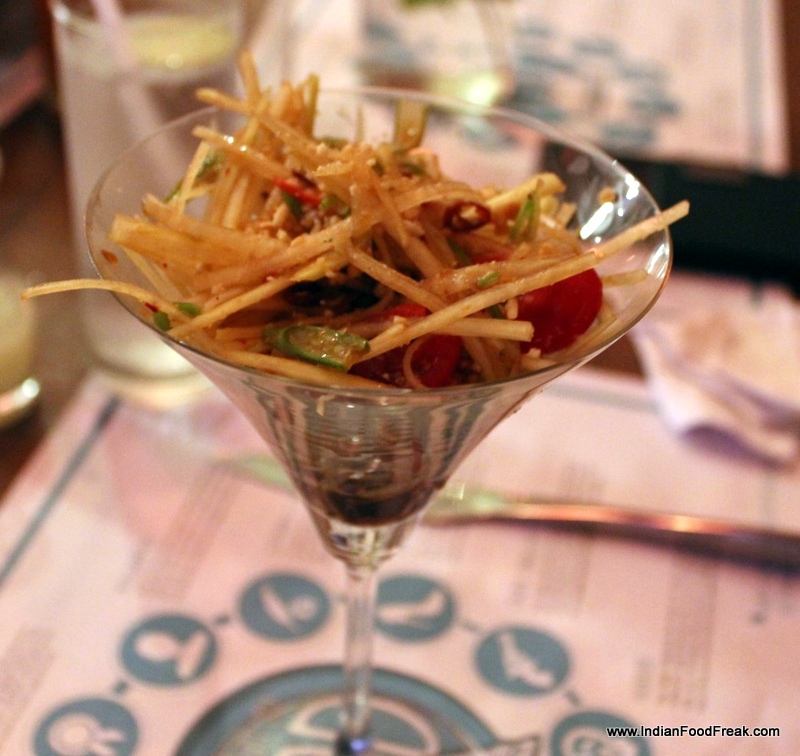 Dejected, we asked for the salads. I had chosen a Som Tam and my partner a silken Tofu and noodle salad. Despite the restaurant being fairly empty, the service was extremely slow and after about 25 minutes the salads were brought to our table. The Tofu salad was a simple lettuce salad with hard tofu and crisp noodles thrown in and with hardly any dressing. The Som Tam was comparatively better but lacked in seasoning and was missing the tart and sweet kick that is typical of a good Som Tam.