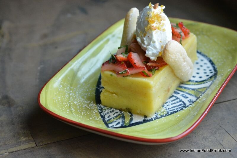 Stuffed to the gills, I eagerly awaited the dessert. First came the Pot De Crème with Salted Caramel(200). This one’s a winner all the way- with just the right texture, right amount of sugar and the crunch from the salted caramel. This dessert also has two slices of freshly made lemon and poppy seed cake served with it which sort of cuts through the intense chocolate flavour. Also on the menu is the Lemon Cake; this one has lemon curd, with vanilla lemon syrup soaked pound cake and has a layer of seasonal fruit on top. I found this dessert to be way too tart, all the three layers- the cake, the whipped cream (lemon flavoured) and the strawberry were sour, which made me miss the sugar in my dessert.