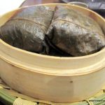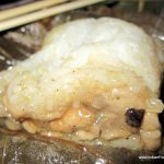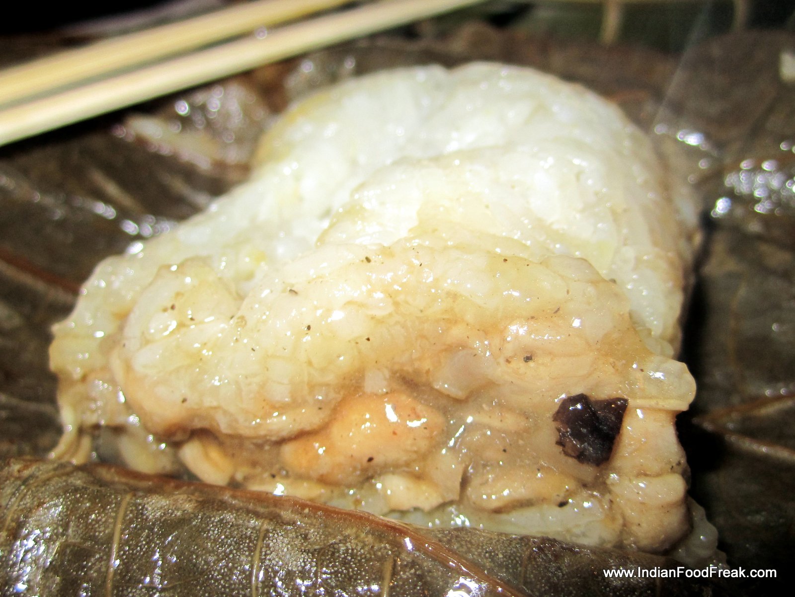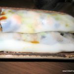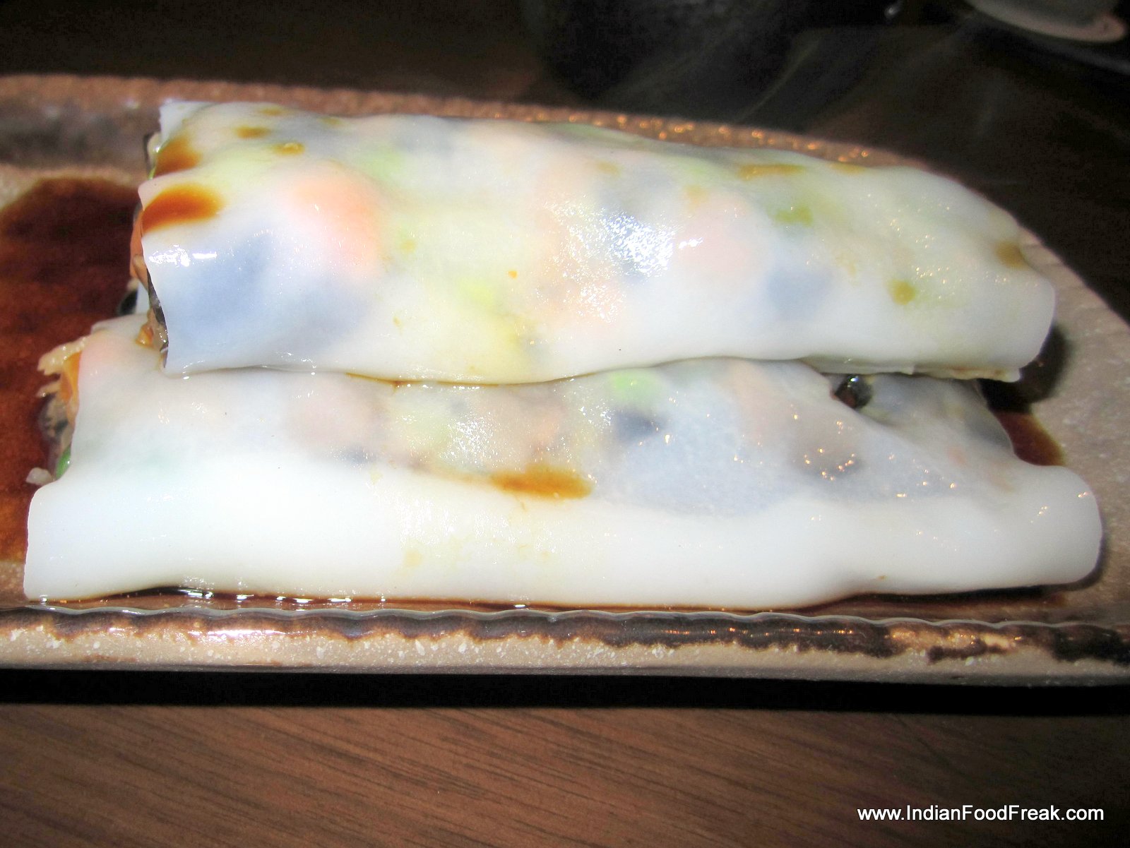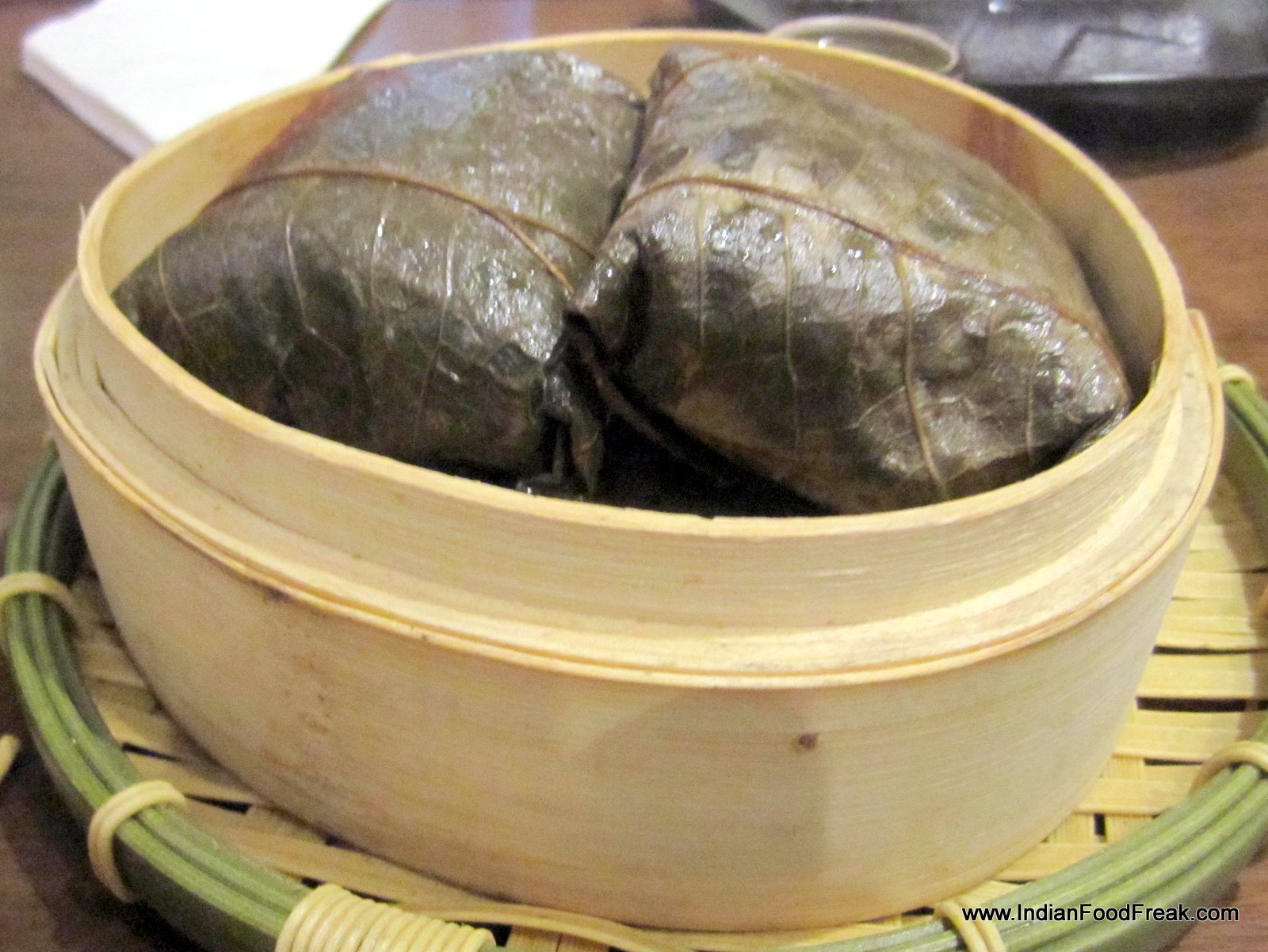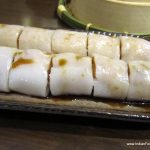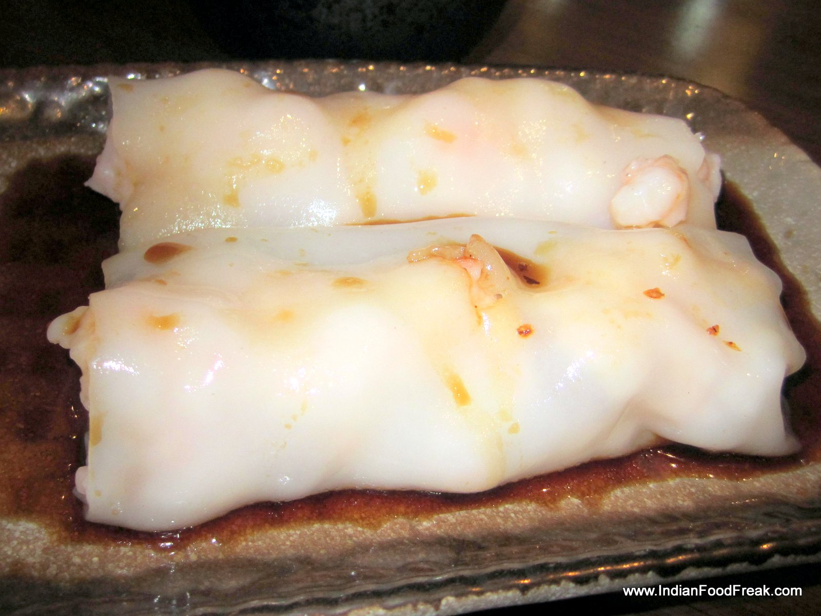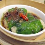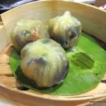 Now comes the dish I have been most eagerly awaiting – the Cheung Fun. A Cantonese dish, it is a thin roll made from a wide strip of rice noodles, filled with shrimp, pork, vegetables, or other ingredients. Sweet soy sauce is poured over the dish upon serving. Since it is not very easy to make, it is not an often found dish in the dim sum menu. Crispy prawn cheung fun (Rs. 475) with its batter fried filling is obviously a favourite here, going by the number of people ordering it, but I prefer the more traditional prawn cheung fun. Equally enjoyable is the vegetarian asparagus cheung fun (Rs. 325). As my carb-fix, I have the delicious lotus leaf parcel with sticky rice and chicken (Rs. 295).