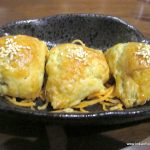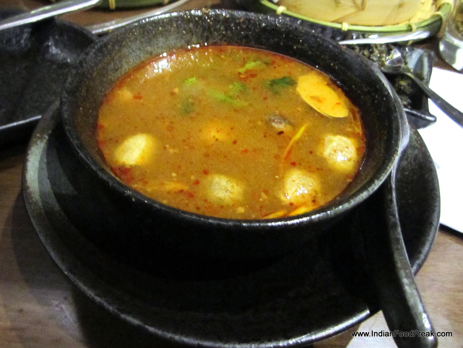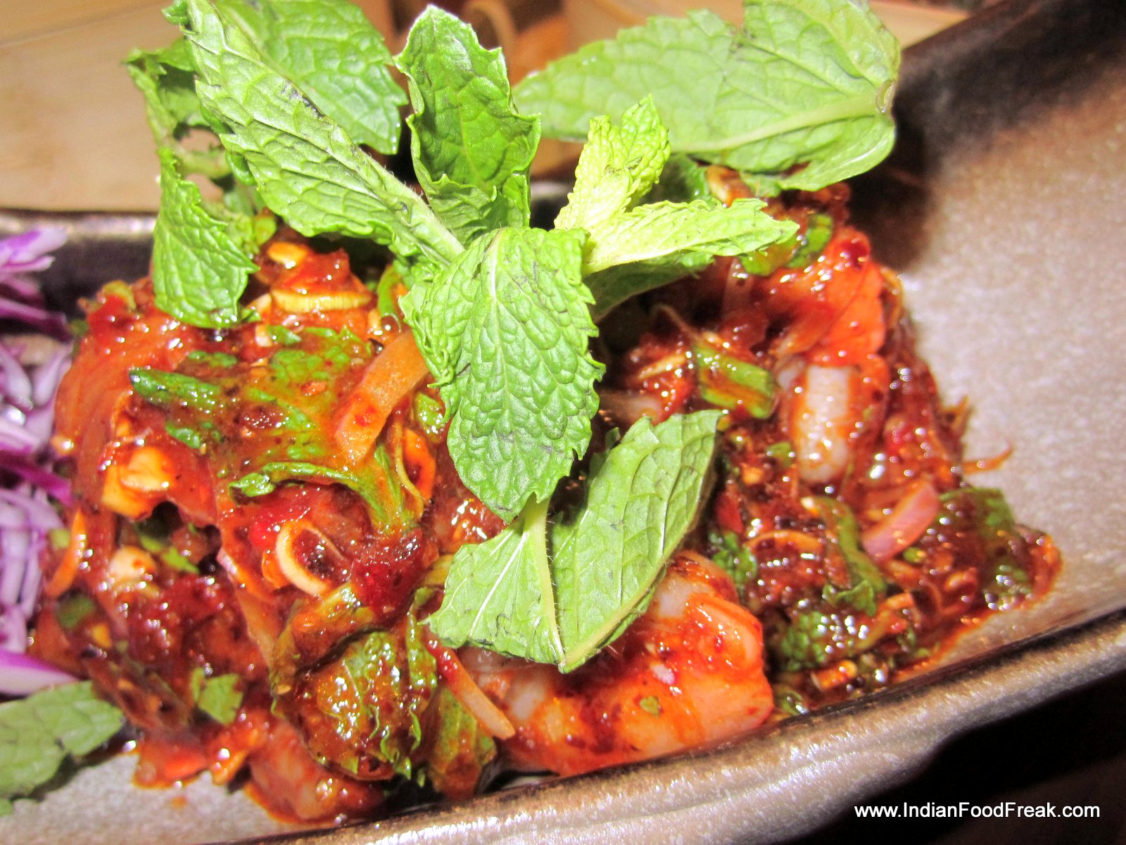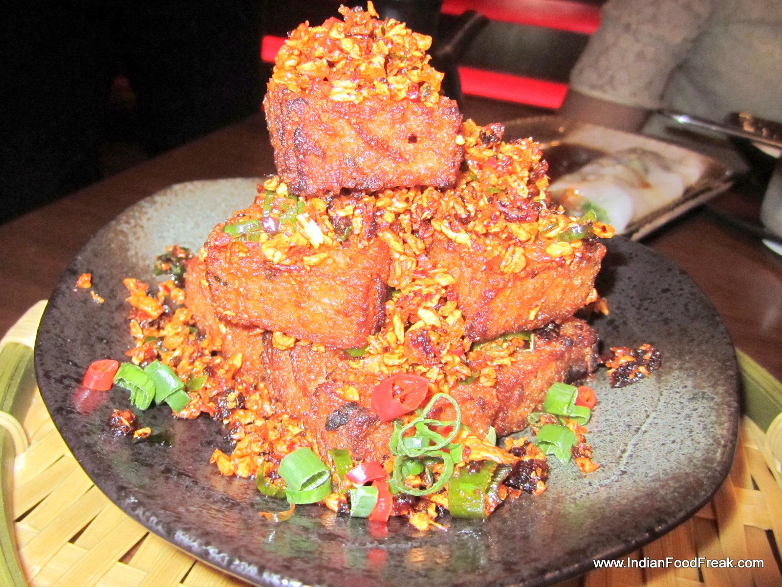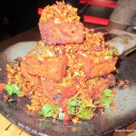 I now take a soup and salad interlude. Tom yum prawn soup (Rs 295) looks great but is somehow lacking in depth. The Nueng Pla Koong salad with steamed prawns in tom yum dressing (Rs 625) would have been a great salad, had there not been a surfeit of fish sauce in it, giving it a bitter and oversalted after taste. Crispy red turnip cake (Rs. 355) with red turnip and vegetable cake topped with spicy dry Garlic Chili is a treat. Pork Puffs (Rs. 295) with roast pork in toasted sesame puffs, and glazed with honey is very much like our own desi puffs available with neighbourhood bakeries.