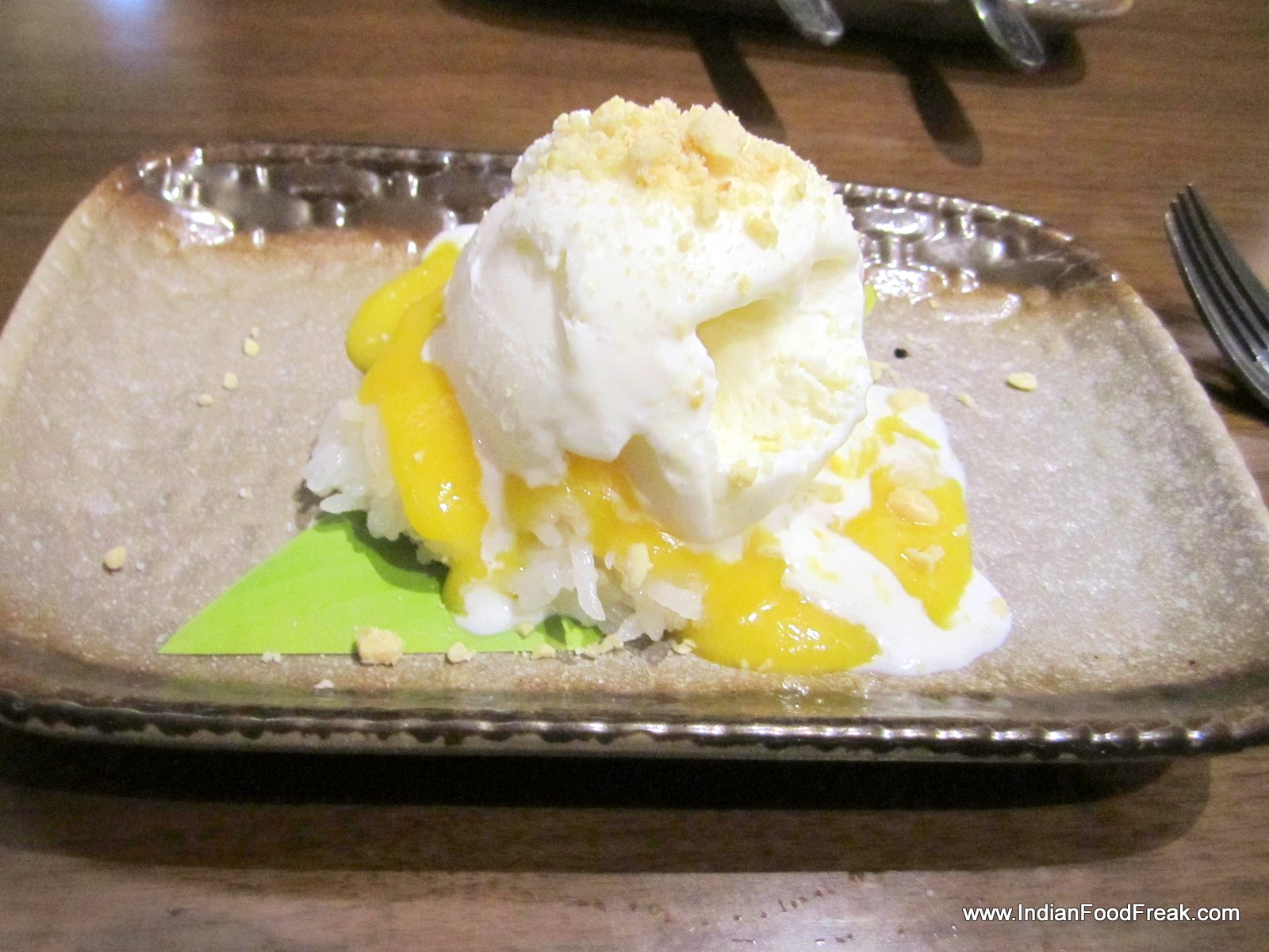 I end the meal on a sweet, comforting note with Tim Kao-Neaw, home-made ice cream with sticky rice and mango sauce (Rs. 375).