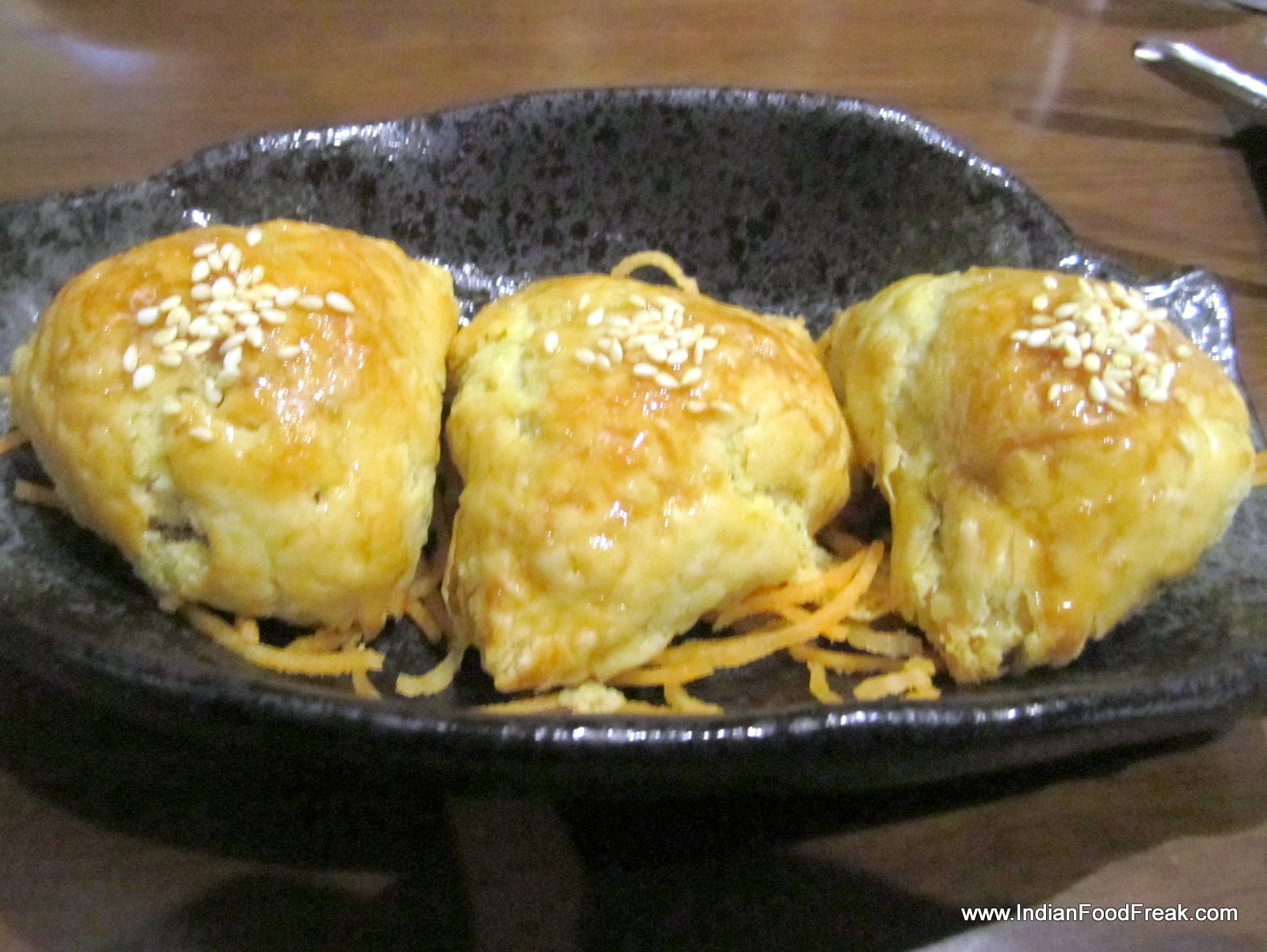I now take a soup and salad interlude. Tom yum prawn soup (Rs 295) looks great but is somehow lacking in depth. The Nueng Pla Koong salad with steamed prawns in tom yum dressing (Rs 625) would have been a great salad, had there not been a surfeit of fish sauce in it, giving it a bitter and oversalted after taste. Crispy red turnip cake (Rs. 355) with red turnip and vegetable cake topped with spicy dry Garlic Chili is a treat. Pork Puffs (Rs. 295) with roast pork in toasted sesame puffs, and glazed with honey is very much like our own desi puffs available with neighbourhood bakeries.