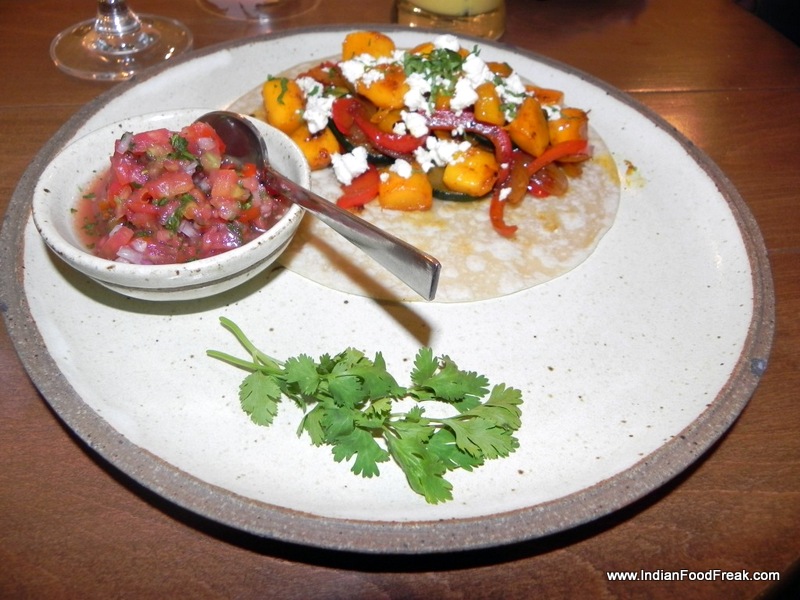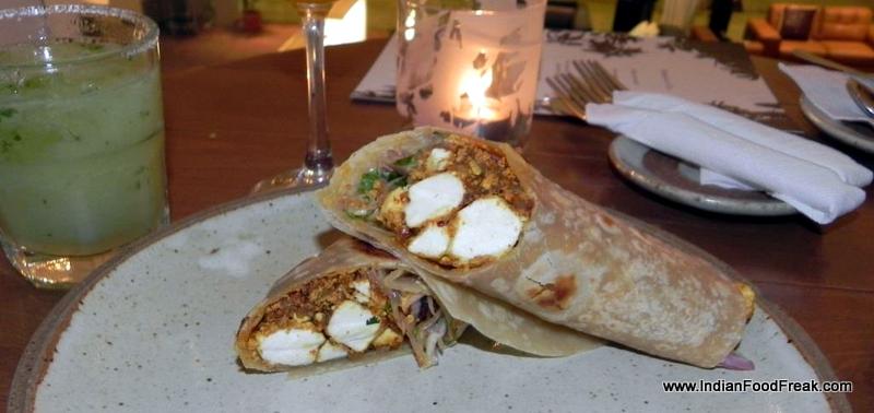 The next was sweet and spicy mango salsa with chips. The mango pieces were firm to the bite which is how a salsa should be. There is nothing more disappointing than a limp salsa. The tastes were very well balanced and for a dish so simple it was one that was quite relished. Then we had the caramelised mango fajita. A little unwieldy to handle due to the bountiful fillings, it was however a lovely dish of how bell peppers and mangoes and onions can be married in harmony. The mango pickled kathi rolls with paneer were delicious. Delicately flavoured they had the tartness of a pickle and at the same time the creaminess of the paneer was not overpowered. I simply loved the dish.