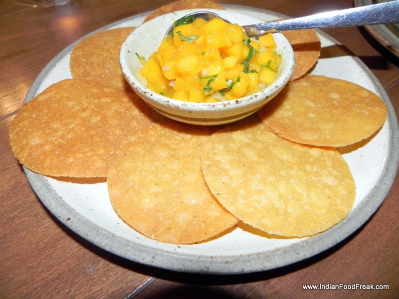 We started with three different drinks. A mango smoothie, iced mango tea and raw mango juice with mint. The iced mango tea was my favourite. A light summery drink with just a hint of green tea and fresh kiwi topped with ripe mango juice. The mango smoothie had all the fruity richness and you can’t go wrong with that. The raw mango juice served with a salt crusted rim was an acquired taste and though pleasant not my favourite.