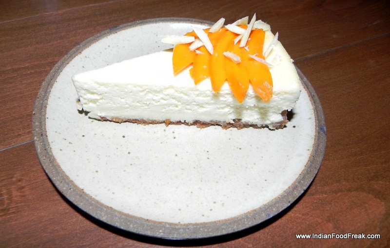 The desserts were almond ricotta cheesecake and mango in tart shells with ice cream. The crusty tart shell along with the mangoes and ice-cream was pleasant. But I can safely say that the cheesecake was the star of the evening, not your usual mango cheesecake but an almond cheesecake with slices of mango. It was a treat for the eyes and the palate.