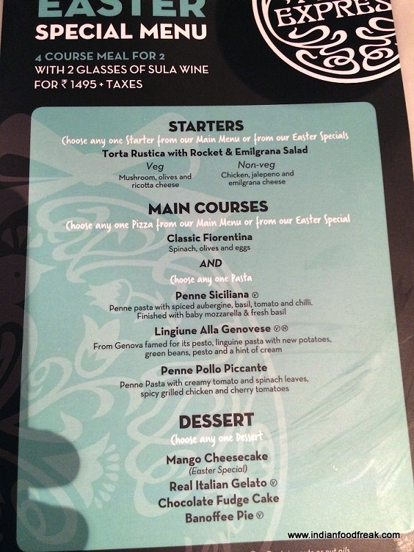 It is quite common for a restaurant to roll out attractive offers once in a while to keep people excited and interested. Promotions help to bring back regulars and attract the first timers. Always a fan of the Pizza Express quality, quantity and services, it was but natural for me to try their Easter Special Menu on my once a month trip to my friendly neighborhood restaurant. And boy was I disappointed – by their portions and their service.