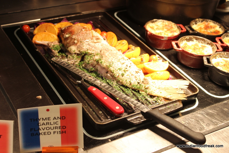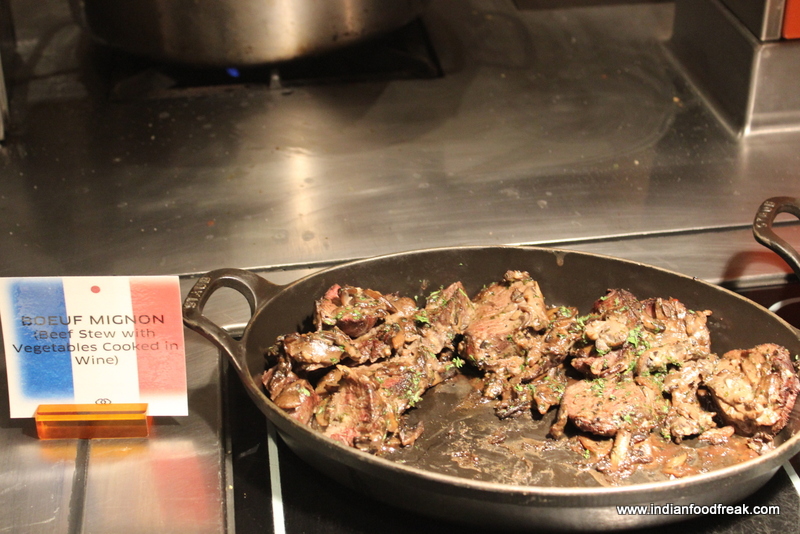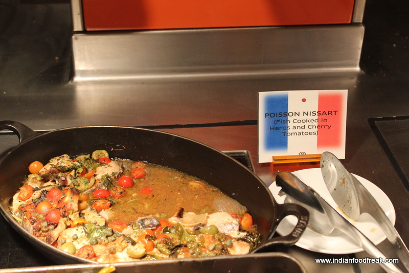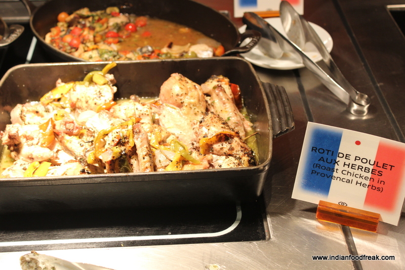 In mains we did a sampling of all the French dishes prepared by the chef. While the stand out dishes of Poisson Nissart (Swordfish cooked in herbs and cherry tomatoes) and the Roti de Poulet Aux Herbs (Roast Chicken in Provecal herbs) were delightfully flavoursome; the Boeuf Mignon (Beef stew cooked in Vegetables and red wine) and the Pouille Roulade (Chicken flutes with Ham) had suffered the vagaries of having sat in the buffet heat for quite long and were overcooked and dry. Though the sauce in the Boeuf Mignon was amazingly delectable, the overcooked meat did pull down the dish quite a bit.