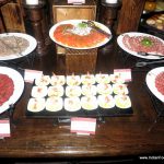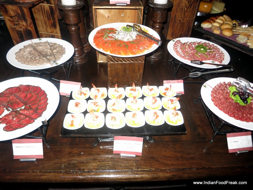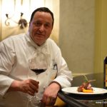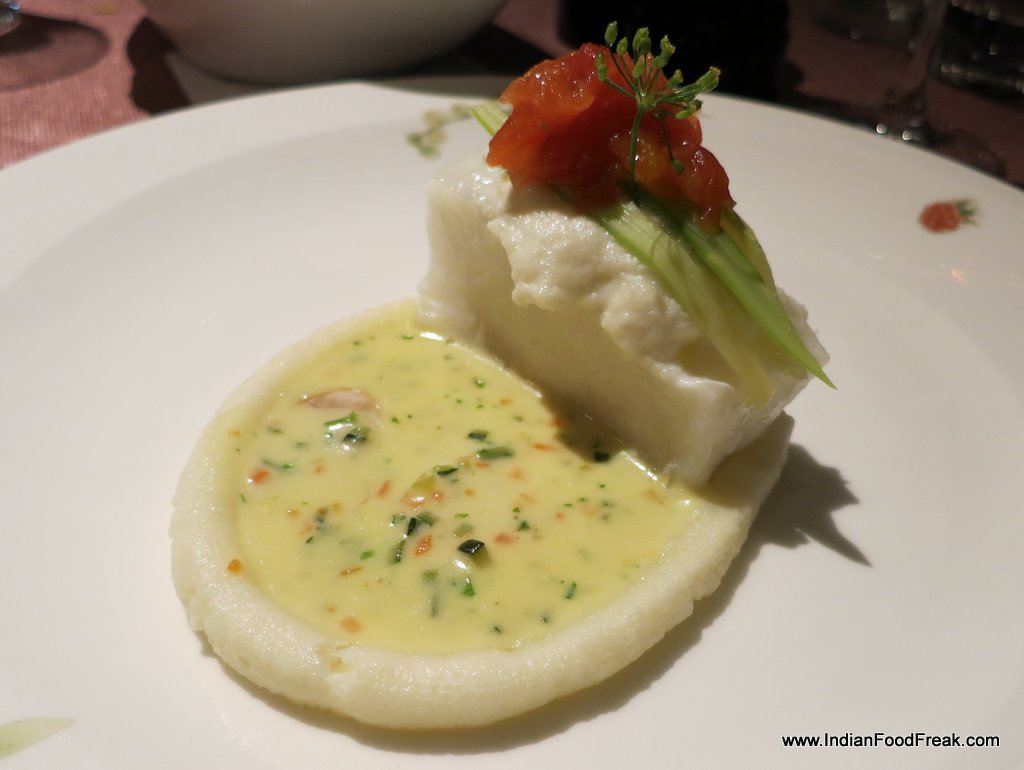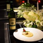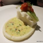 001The evening began with a glass of chilled bubbly, the sparkling Brut Rosé from Bouvet Ladubay, an excellent Crémant from Saumur in Loire Valley. This winery was acquired by the UB Group in 2006 and this is when Four Seasons started its operations in Baramati, a small town located two hours from the city of Pune. The Rosé was a perfect accompaniment to the hors d’oeuvres and charcuterie. The saltiness and the spices of the cold meats enhanced the flavours of the Rosé. Chef Wyss created a spectacular Gruyère Foam Crostini which showed his fondness for molecular gastronomy. He is a big fan of Heston Blumenthal and Peter Gagnaire and often eats at Ferran Adriá’s El Bulli.