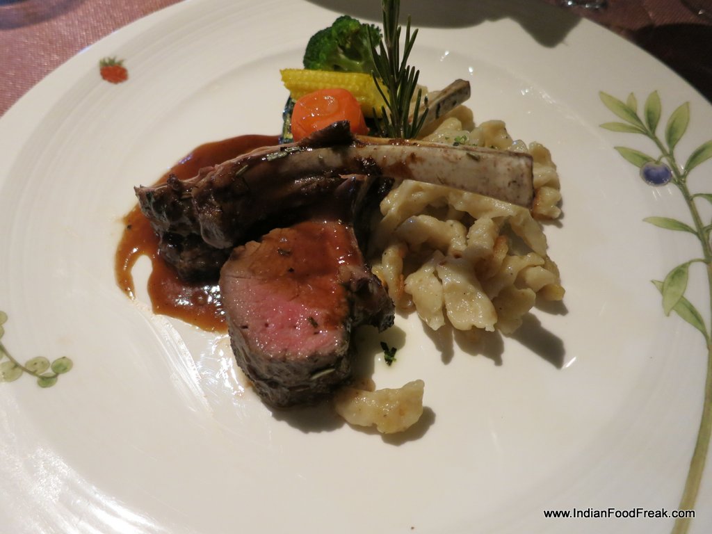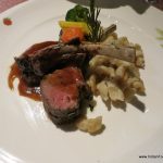 roasted lamb rackThe next course was a Roasted lamb rack with espelette pepper jelly and Borolo sauce with shallots, spatzli with wild garlic and seasonal vegetables. The wine with this was the Four Seasons 2009 Barrique Reserve Cabernet Sauvignon, a wine with well integrated tannins and potential for aging.  This was a match made in heaven and both complemented each other perfectly.
