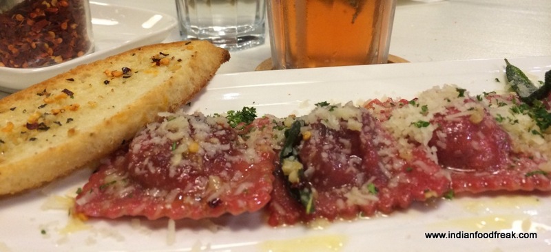 We started the night with salads and first tried a Beetroot and Arugula Ambrosia. The Arugula salad is generally served with Pears but we had ours with Beetroots that night. Served with walnuts, crispy Rocket leaves and a balsamic reduction, the salad is light and full of flavour.