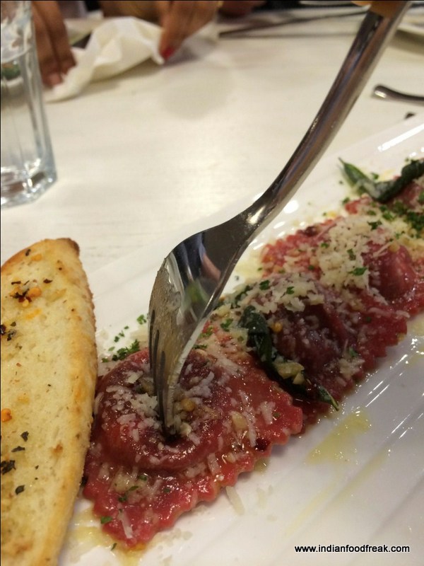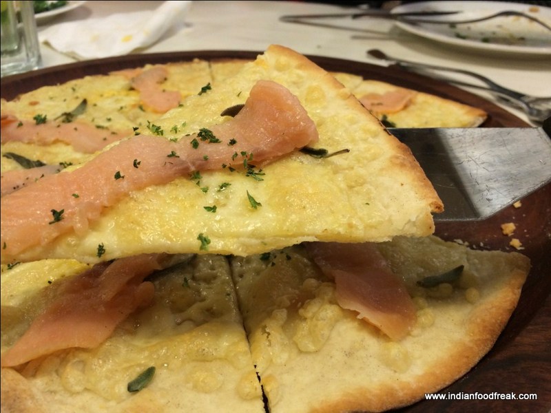 It was finally time to try the long-awaited pizzas and here I must commend Francesco’s on the bases. I loved the thin crust all the pizzas were served on and liked it that they were not paper thin like papads but had a nice bite to it. Also, we were told that their pizzas are cheaper than the ones at Dominos, which was indeed a pleasant surprise.