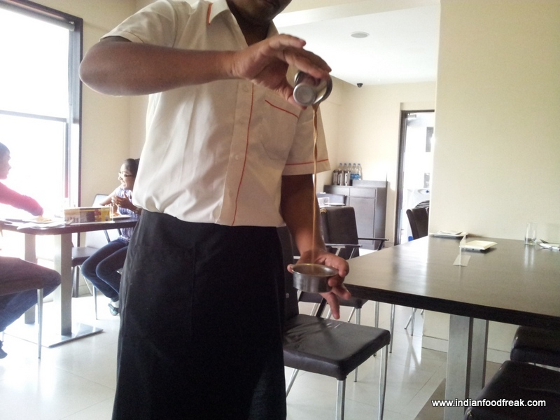 For dessert, we had sev payasam and mango payasam. They were perfect desserts for an afternoon lunch, light and delicious. They also served chopped fruits, sliced Brownies, Phirni and a bowl of mini Gulab Jamuns. The Brownies slices were dry. They felt stale in fact. The Gulab Jamuns were at room temperature, which is really not the way I like them. They did bring me hot Gulab Jamuns on request. After lunch we requested for filter coffee. I am more a tea person than a coffee person, but this was one of the best filter ‘kaapis’ I’ve ever had.
