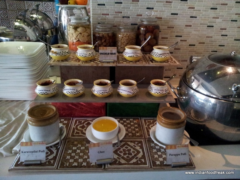 They had a salad table laid out with curd rice, cabbage mayo, green salad and a delicious peanut salad. They also had a pickle bar with various kinds of pickles and podi masalas.