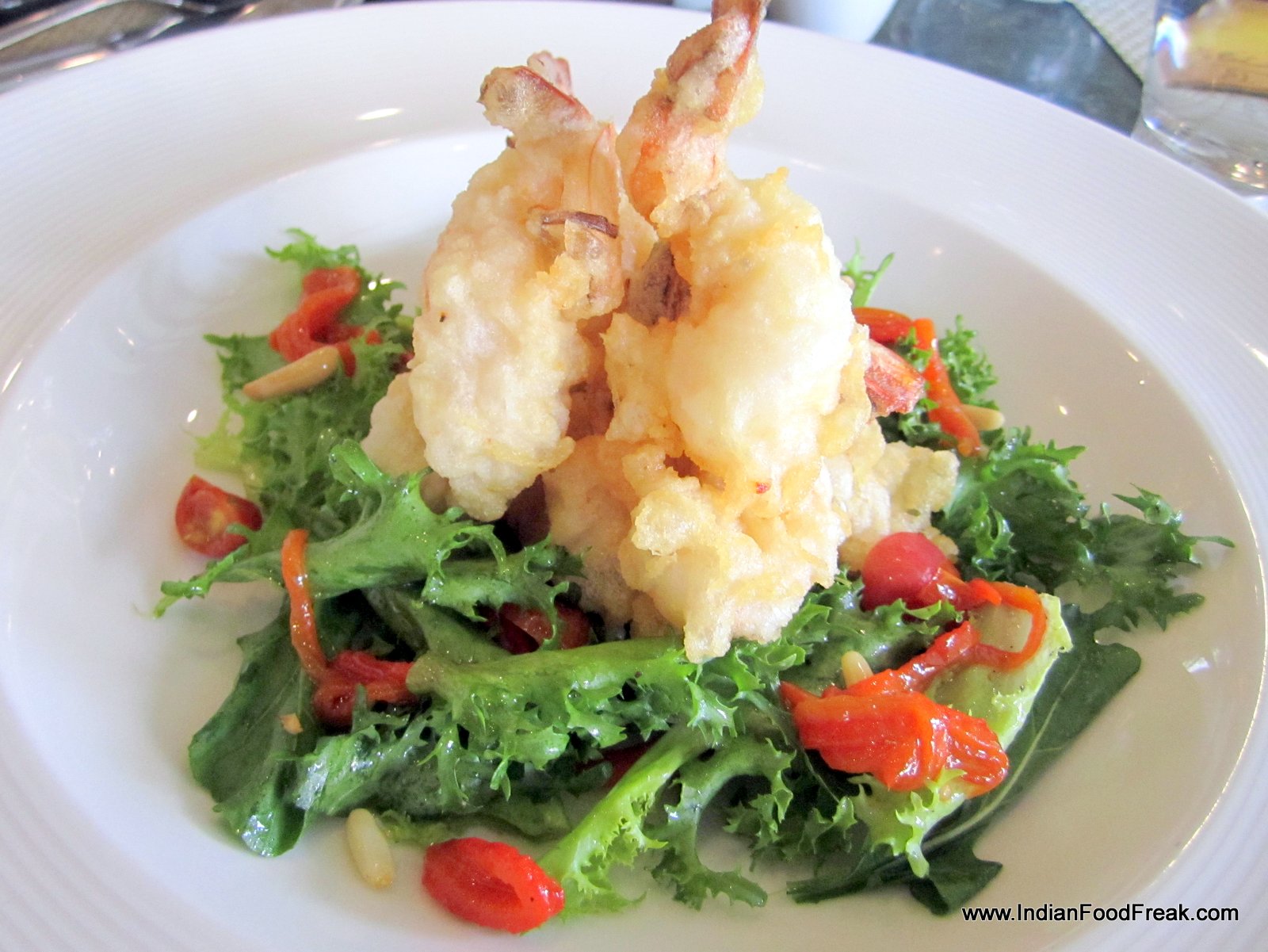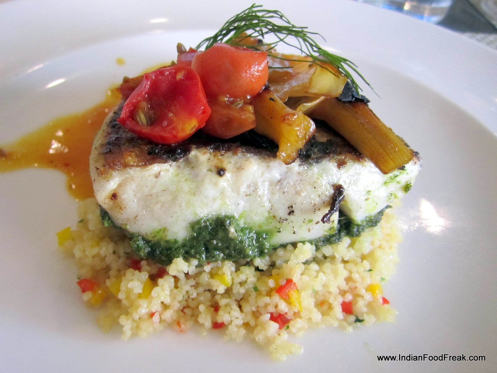 Blooms has got a new look and now sports a cleaner look, though the overall mood stays that of old-worldly elegance. Vaishali joins me for the tasting and so does Suprabhat Roy, Executive Chef of the hotel. On Suprabhat’s insistence, I start my tasting with Bruschetta (Rs 695) which is a fresh toasted baguette with marinated shrimp, fennel and avocado. It’s a very pleasant dish, and the combination works. Suprabhat ensures smooth service and fresh dishes arrive the moment I finish one. Next on the table is Prawn Beignets (Rs 1095) with batter fried king prawns with romesco sauce on a bed of deconstructed salad of bell peppers, almond and roasted tomato. While the prawns taste fresh and are cooked proficiently, what steals the show is the exciting salad underneath.