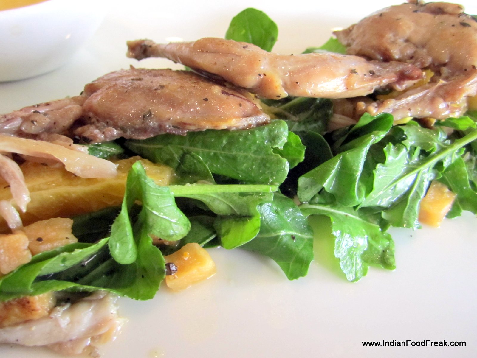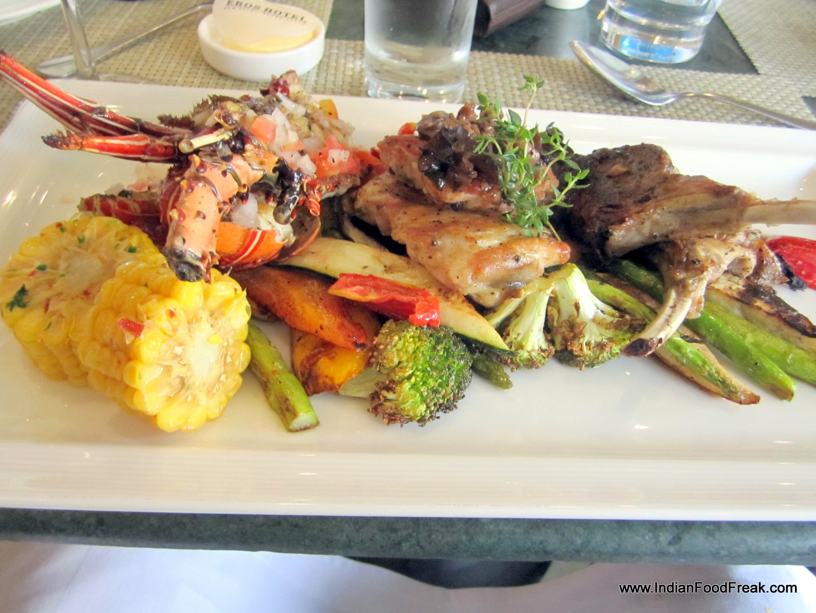Roasted Quail (Rs 745): pan seared Japanese quail with caramelized apple, rocket lettuce and orange vinaigrette is somewhat unidimensional, and can taste much better if the extra sweetness is cut by something tart. I have been looking forward to their next dish, Blooms Mixed Grill Platter (Rs 1995) modified on my request to include grilled chicken thigh, lobster and New Zealand lamb chops. Alas, this dish is a disappointment. While the thighs are only slightly overcooked, the lobster has lost all its natural buttery taste due to significant over-grilling. Also the lamb chops when cut, are grey brown inside, rather than the customary pink. I know Indians like their meat well done, but this is way beyond well done.