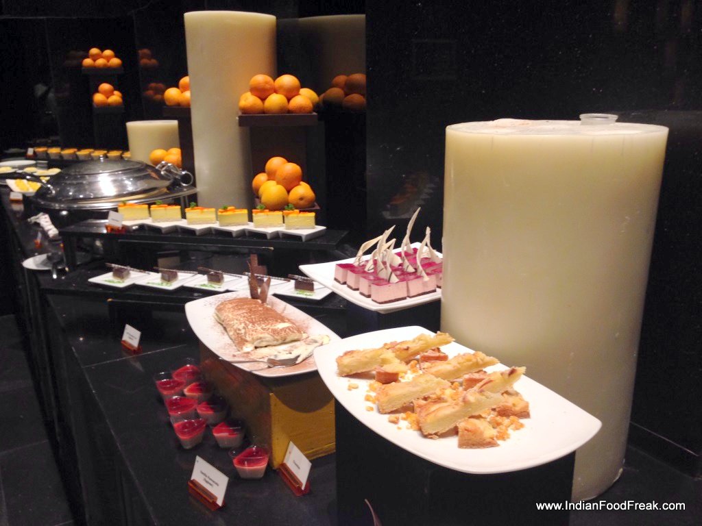 The main course had vegetable fried rice which was made of sticky unpolished rice and was a welcome change to the usual. The noodles in gram onions was extremely well balanced with just hints of flavours so as not to mar the other dishes like the squid in vegetables, the chicken in cashews or the scallops in broccoli. The scallops in broccoli were absolutely well cooked, not over done which could have easily happened considering that they were in the buffet. The fresh taste of squid came out well inspite of the stronger vegetables like bell pepper. The chicken was a disappointment as it had gone dry however the sautéed cashews tasted quite good.