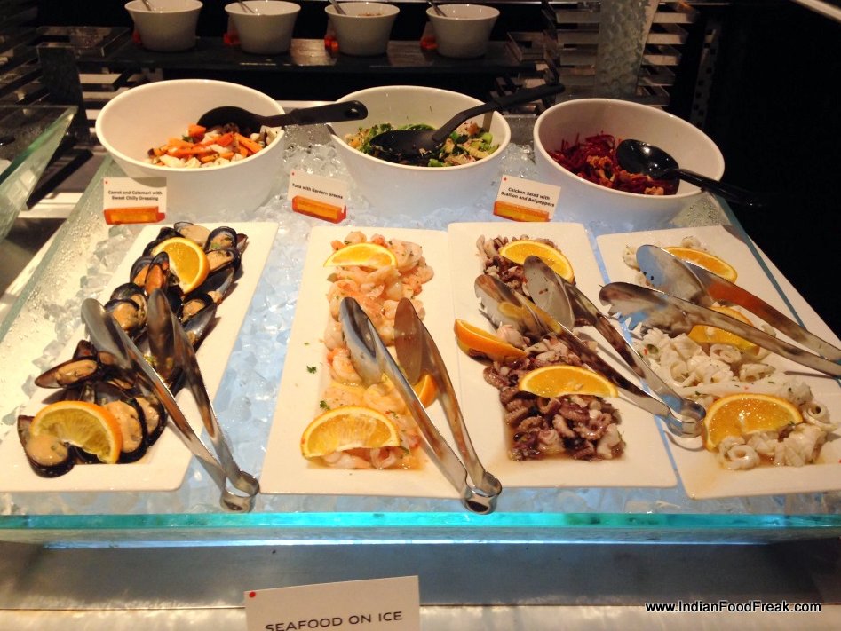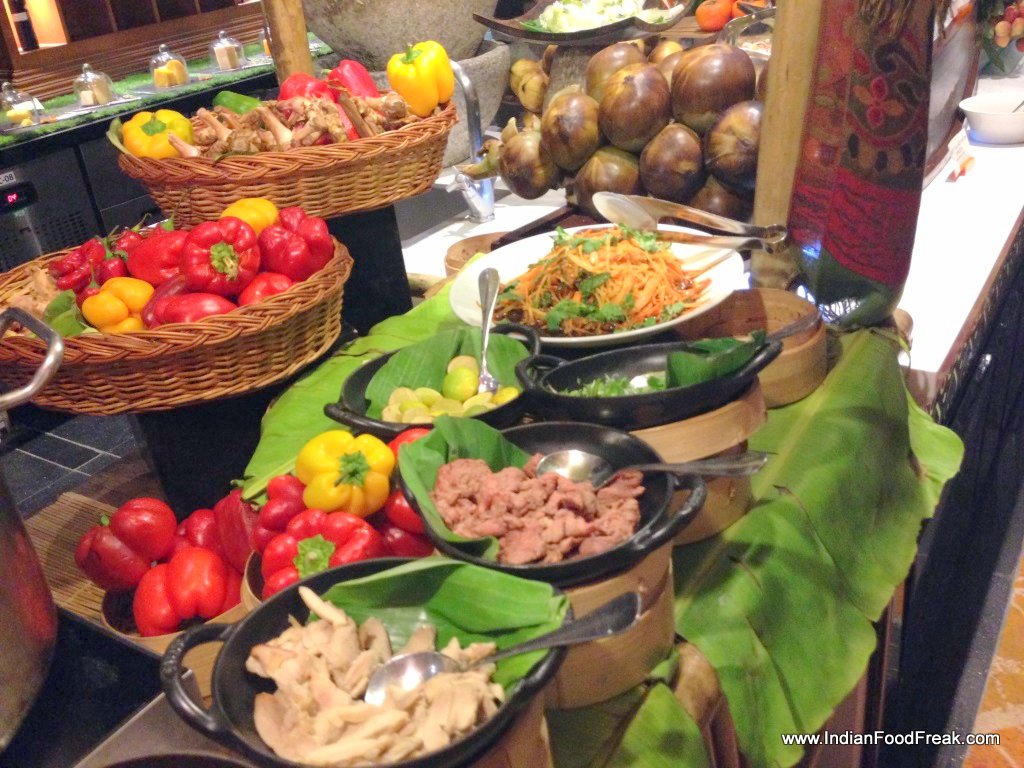 We started with the lettuce and prawns rolls which were delicious and fresh. The beef salad with bell peppers had just the right bite of chillies with sourness. The chicken and lotus stem salad was deliciously unusual. The live counter had the bubbling cauldron of delicately spiced hot-pot which we had with assorted vegetables, noodles, fresh coriander, bird eye chillies and beef. The beef was so succulent and melt-in-the-mouth, that I found myself recommending it to a young lady who was confused whether to have beef or chicken. The broth for the hot pot was cinnamon and star anise based burst of flavour. I could have easily eaten a whole meal with a good crusty bread.The hot and sour seafood soup was however a little drab and would not be missed if one didn’t try it. Though the seafood in the soup had a beautiful smoky flavour I wish they had made the soup more robust. The broth had almost coagulated to a corn-floury consistency.
