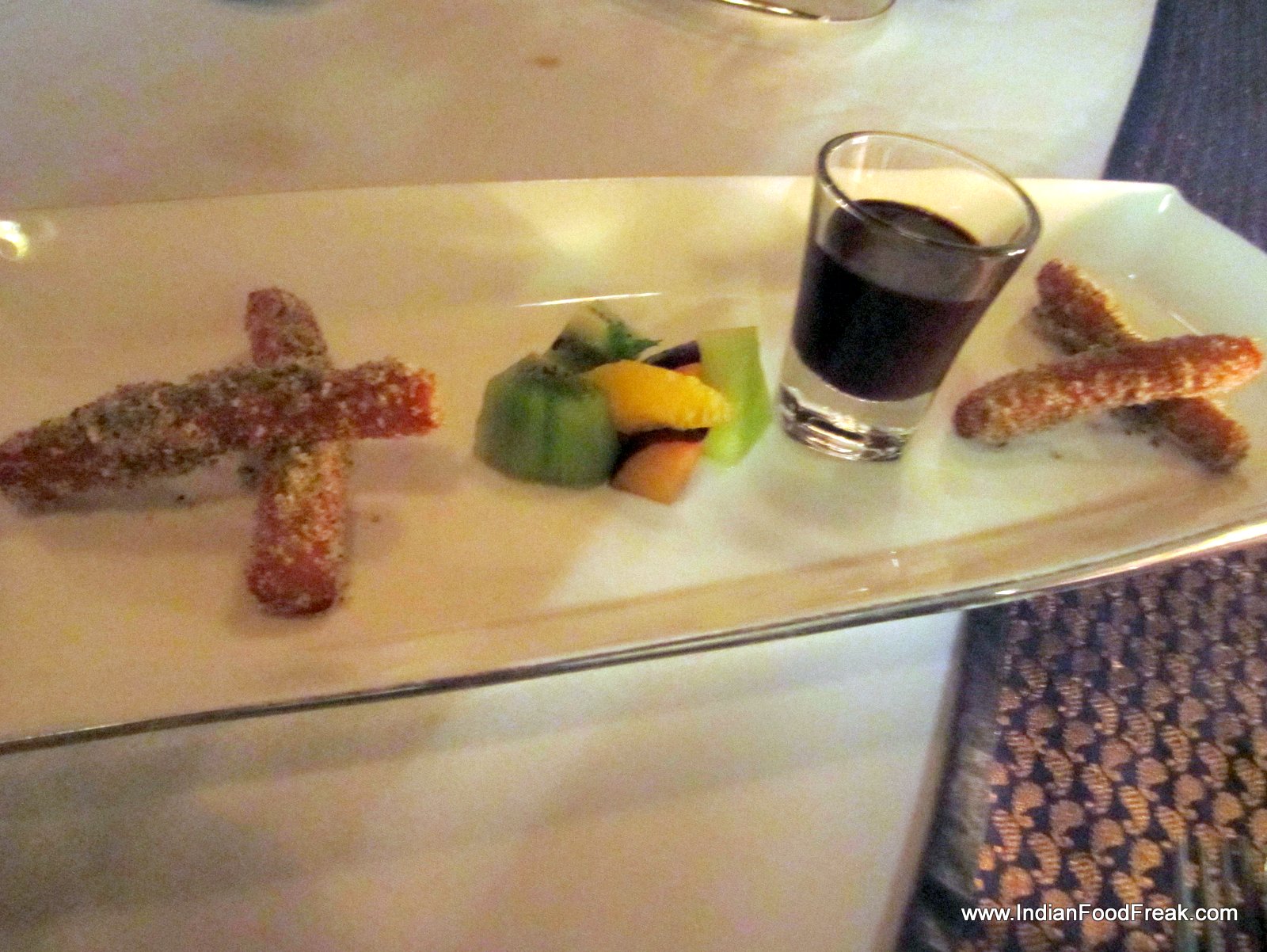 With very little space left for dessert one is contemplating skipping the dessert course, but Ashwani recommends we do try a couple of them . Dark chocolate fondant (Rs 795) is an indulgent soft centered dark chocolate fondant served with banana jelly, chocolate soil, raspberry reduction, banana gelato. And how can one leave a Spanish restaurant without having their Classic Spanish Churros (Rs 795)? How can one go wrong with a churro flavoured with cinnamon powder and dusted with Iranian pistachios served with warm chocolate sauce? It is a perfect end to a most memorable meal.