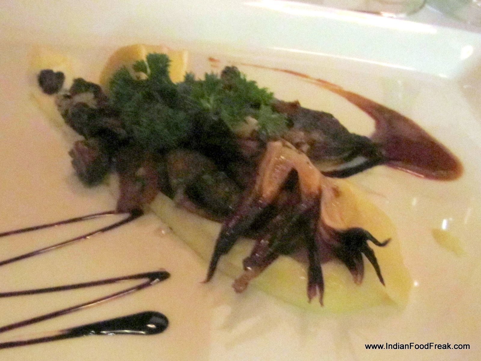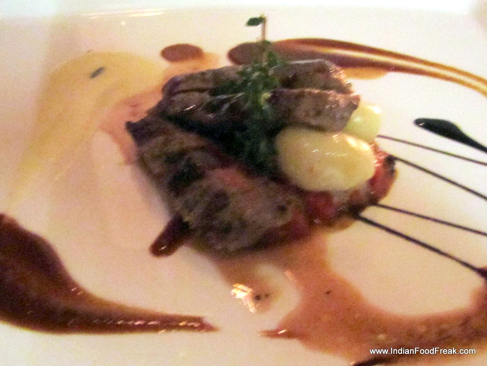 Wagyu (as per Wikipedia) refers to meat from a breed of cattle, which is genetically predisposed to intense marbling and to producing a high percentage of oleaginous unsaturated fat. This meat is known for its quality, and demands a high price. It is also known by various other names, including Kobe. Here what we are served is charcoal grilled Wagyu (Rs 3995) with sage gnocchi, sweet paprika and onion marmalade with burgundy sauce. The dish is so beautiful, it literally brings tears of joy to my eyes. A crispy first bite into Wagyu leads to a perfectly yielding meat with an unforgettable taste.