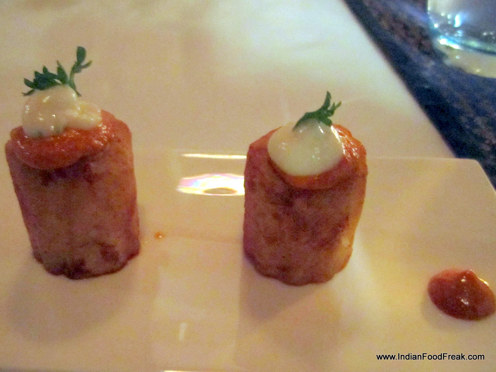 Soon after we are seated, we are served some of the restaurant’s classic Sangria, which is beautifully made, getting us excited about the food to follow. We are also served an amuse bouche of goat cheese rolled inside watermelon along with watermelon juice. The stage is now set for the tapas courses. Ashwani has decided to serve a vast array of delicious appetizers in small plates. He also recommends a Spanish Chardonnay (2010) to go with it, and it truly is an excellent wine.