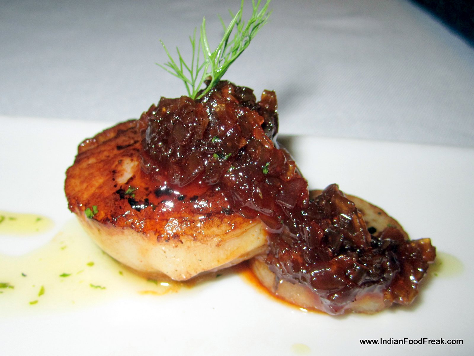 Wagyu (as per Wikipedia) refers to meat from a breed of cattle, which is genetically predisposed to intense marbling and to producing a high percentage of oleaginous unsaturated fat. This meat is known for its quality, and demands a high price. It is also known by various other names, including Kobe. Here what we are served is charcoal grilled Wagyu (Rs 3995) with sage gnocchi, sweet paprika and onion marmalade with burgundy sauce. The dish is so beautiful, it literally brings tears of joy to my eyes. A crispy first bite into Wagyu leads to a perfectly yielding meat with an unforgettable taste.