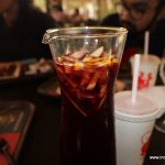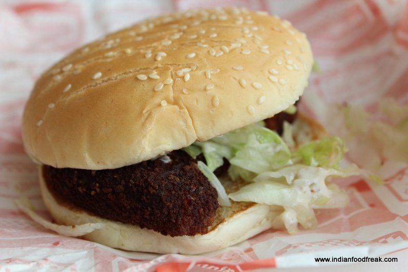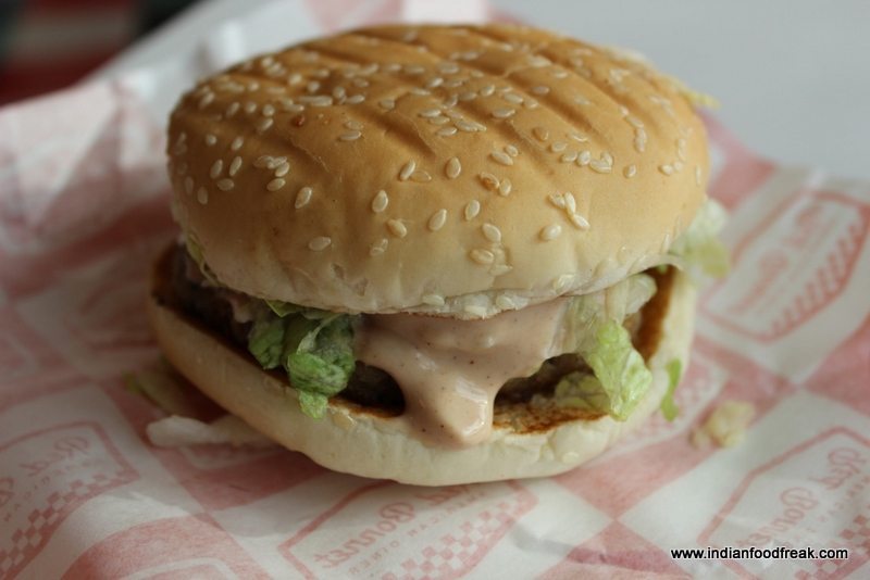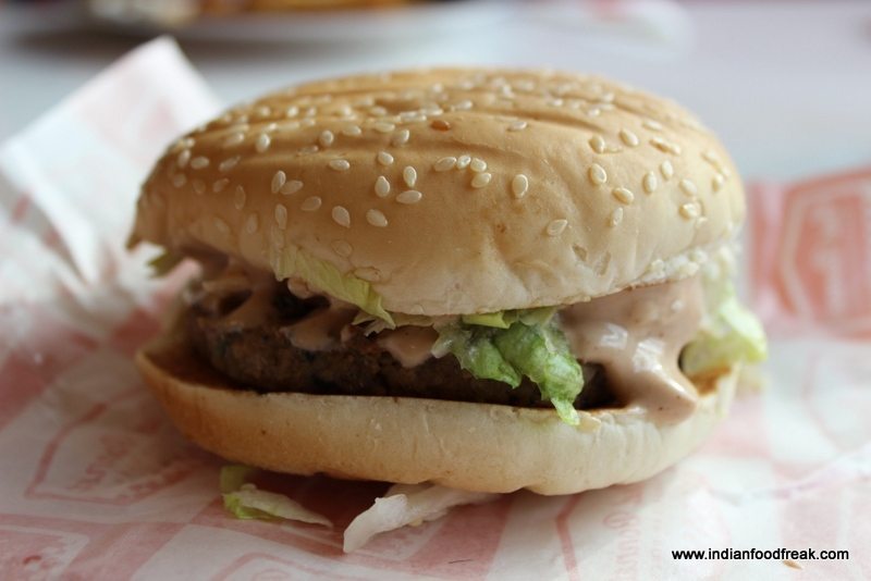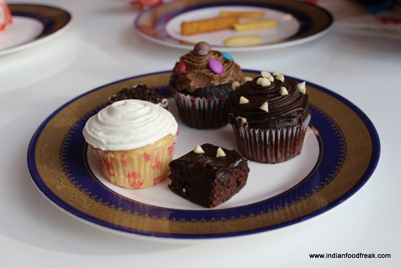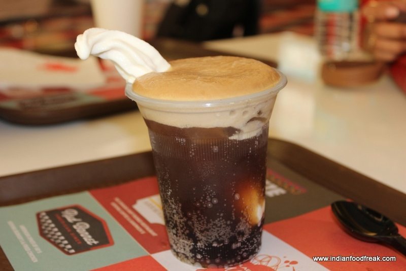 Red Bonnet is designed like a classic American diner in red and white patterns and has two beautiful red Cadillacs adorning the entrance. The menu also is classic American with burgers, shakes, malts and hot dogs. Our snacks included an over cooked (Slightly burnt) mutton burger, a well-seasoned chicken burger, lovely soft cupcakes and a vanilla coke float. I also had a chocolate shake which was quite thin and synthetic.