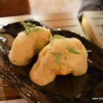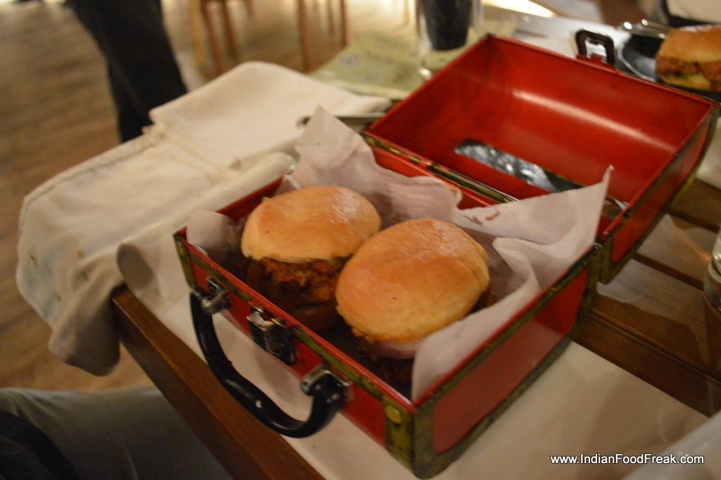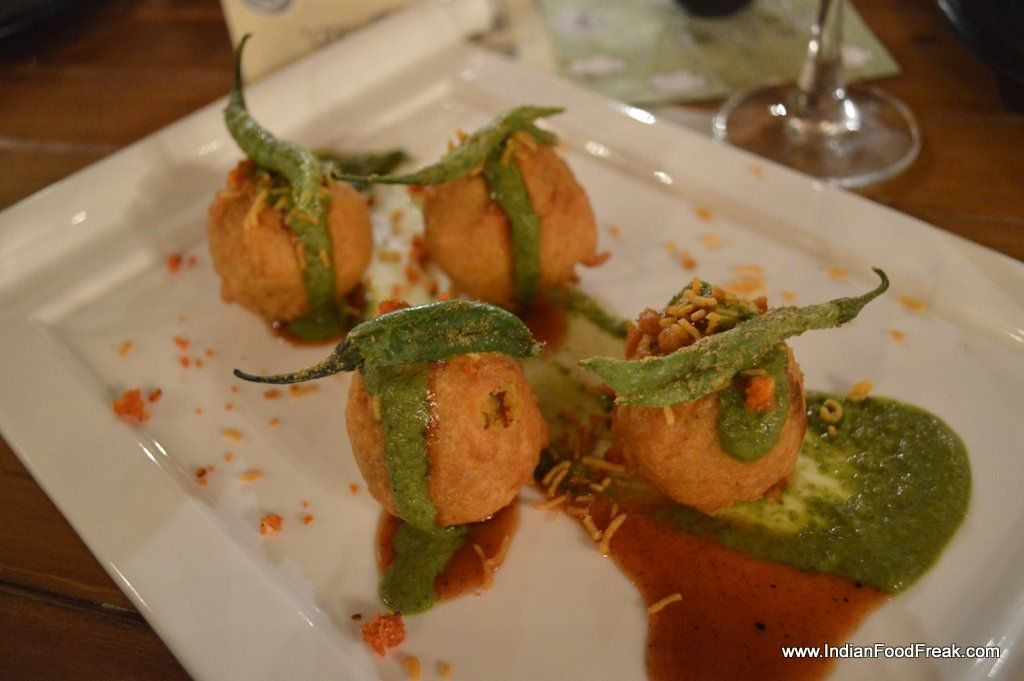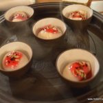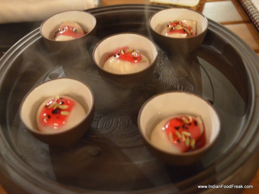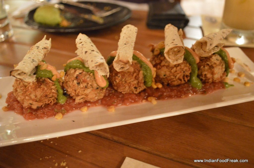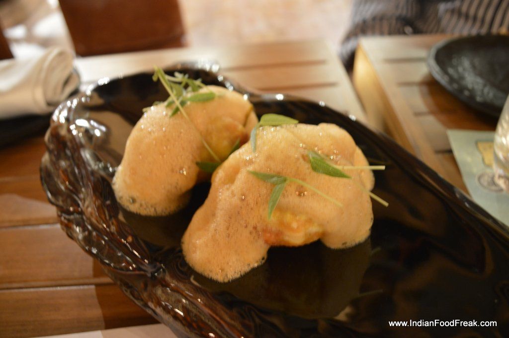 Farzi is based on a concept of modern Indian bistro serving lots of Tapas style (finger food) menu that can easily be accompanied with drinks. Coming on to the menu, a lot of dishes are planned for the media sampling, and we start with the amuse bouche (a small complimentary appetizer), Mishti Doi Shot made with reverse spherification and served with strawberry coulis and panchforen masala; A lovely way to start with mishti doi gel bursting in the mouth and cleansing the palate. Normally reverse speherification gives a tad thick membrane; surprisingly this one is just apt.