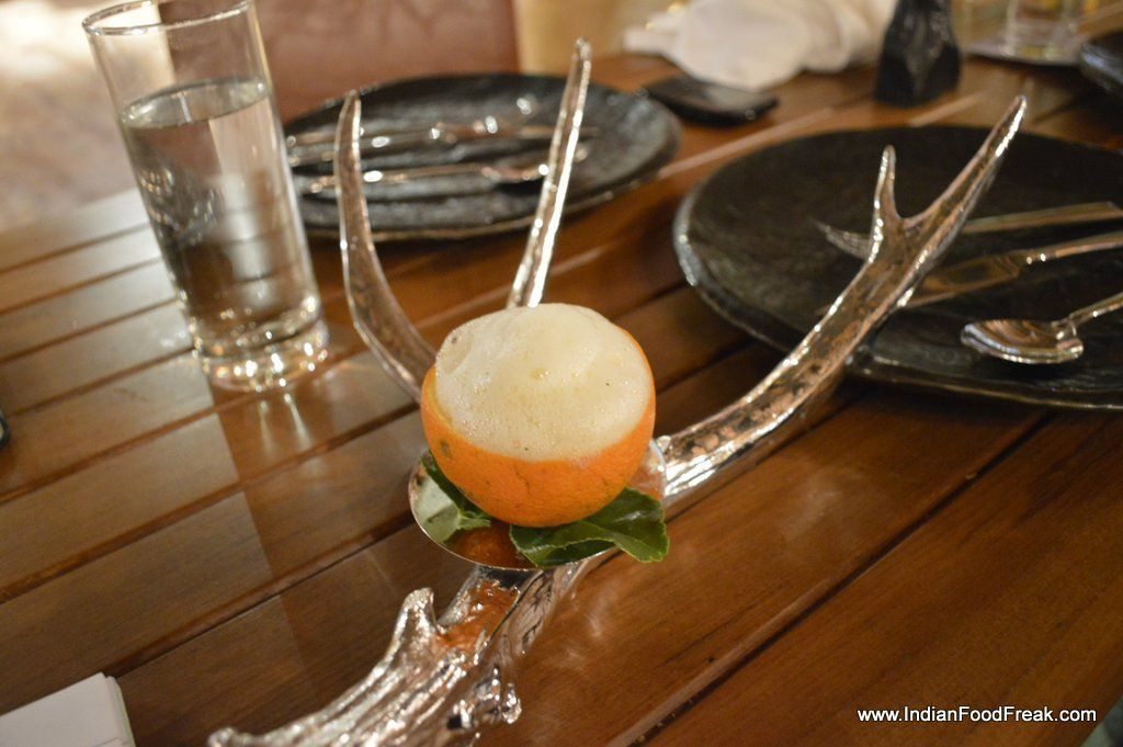 For desserts if you literally want to tell your friends, “Ja hawa kha”, try the nasik orange and kaffir lime aire (Rs 150). A refined version of something similar to Makhan Malai also popularly known as Daulat ki Chaat in Delhi, it is a froth served in orange skin that disappears as soon as it is popped in the mouth leaving a sweetish-citrusy flavor.