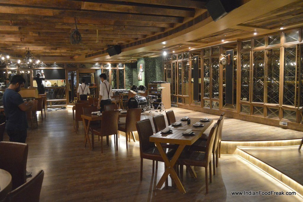 Farzi is an Urdu word meaning non original, not genuine or fake, and I am at Farzi café for a preview that will shortly open (20th Jul’14) for public. The décor at Farzi is something that deserves a second glance, or may be third and fourth too. A big 55mtr bar, teak wood tables, real wood flooring, comfortable yet chic interiors, a 120-seater yet spacious feel, a raised stage for live gig, faux grass walls, and much more; it certainly doesn’t look like any other café.