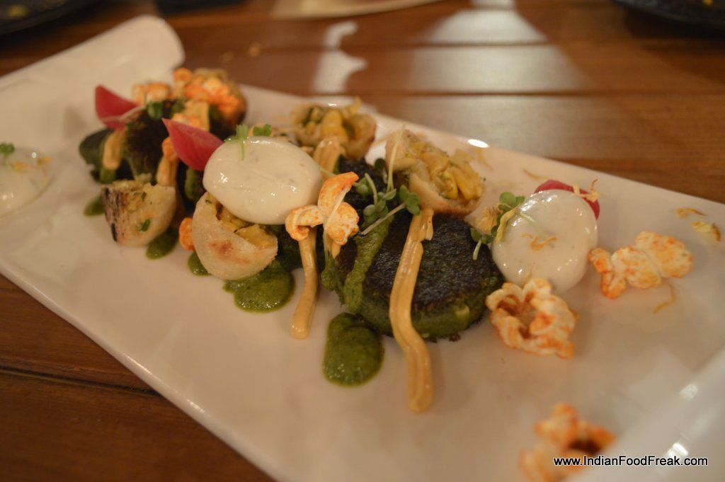 The cocktails are interesting but the molecular twist to the drink is missing, atleast on the ones that I tried. Smoked GJT is a Smoked Gin mixed with Jasmine Tea Decoction. The first sip is a little too smoky but mixed with a little more jasmine it tastes brilliant. Incredible Velvet Martini has Vodka in red wine reduction mixed with fresh grape puree and lemon Juice. I enjoyed Farzi’s Apple foamintini is another vodka based cocktail with fresh green apple extract mixed with elderflower syrup and mint foam on the top. All priced upwards of Rs 355, anyone looking to experiment would enjoy them.