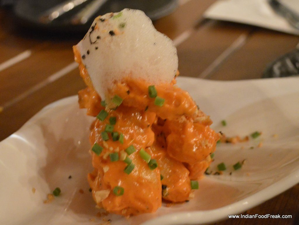 Farzi is based on a concept of modern Indian bistro serving lots of Tapas style (finger food) menu that can easily be accompanied with drinks. Coming on to the menu, a lot of dishes are planned for the media sampling, and we start with the amuse bouche (a small complimentary appetizer), Mishti Doi Shot made with reverse spherification and served with strawberry coulis and panchforen masala; A lovely way to start with mishti doi gel bursting in the mouth and cleansing the palate. Normally reverse speherification gives a tad thick membrane; surprisingly this one is just apt.