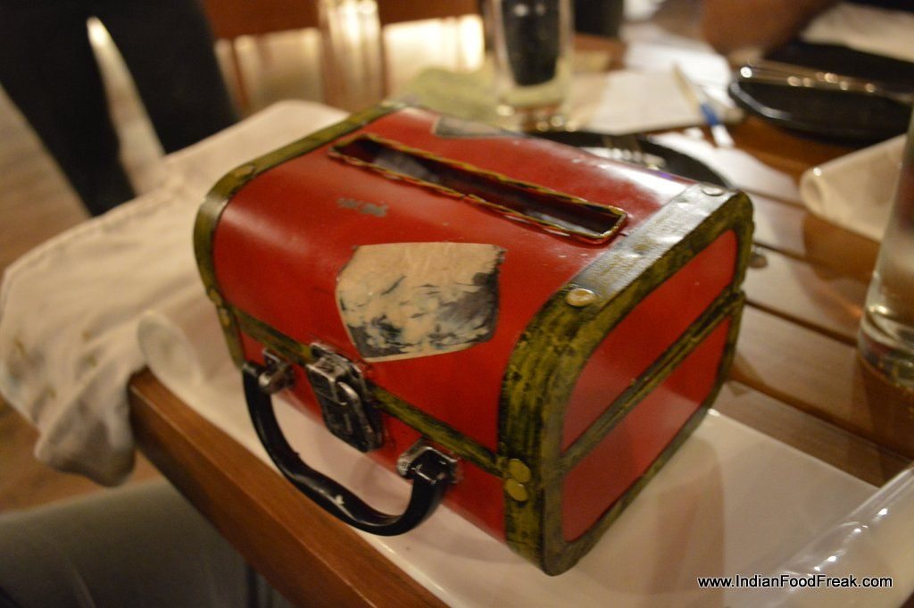 Phirni oxide (Rs325) has lot of drama with nitrogen smoke flying all over, however it misses the true blue phirni flavors. This is still the preview phase. Since all other dishes have almost been perfected, I am sure Farzi Café will work on this too. Don’t miss to end the meal on complimentary served Pan Gujiya; a new twist to the dried pan being served at most places these days.