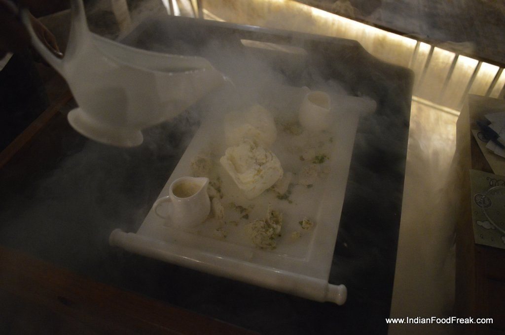 If you are fond of chaat, don’t miss Farzi Café version of Raj Kachori (Rs 210). Mini crisp raj kachori’s filled with crisp okra salad topped with foam that taste of meethi chutney is a sure shot winner. I did not imagine eating a cold panjeeri textured dish that tastes just like our bhelpuri (Rs 210). Used making liquid nitrogen, this is again a dish that is not only addictive but will surprise many guests too.