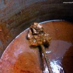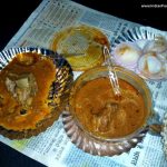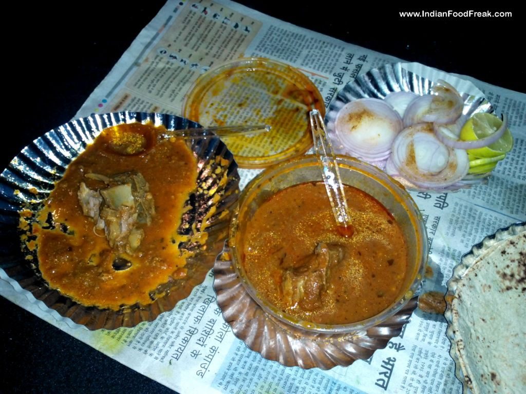 After asking for the directions from various people we finally managed to reach there. This 25 year old word of mouth success is managed by Babloo, a very humble and quiet gentleman. To our surprise, there was no backlit board highlighting the name of the shop. It’s a small take away which only serves mutton curry and tawa roti with onion salad. Such is a confidence of the owner on his preparation. The mutton Curry costs Rs. 200 with 2 pieces of mutton and only gravy costs Rs. 140. One has an option to either take the packed mutton curry home or do the famous CAROBAAR (eating on the parked car).