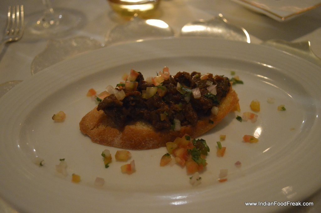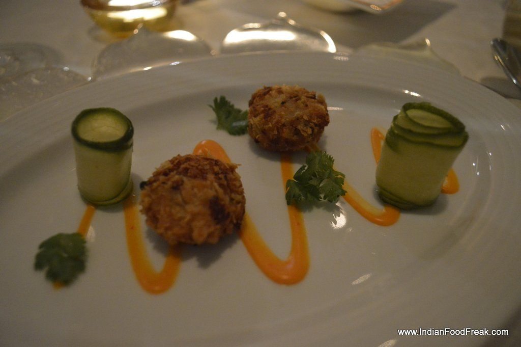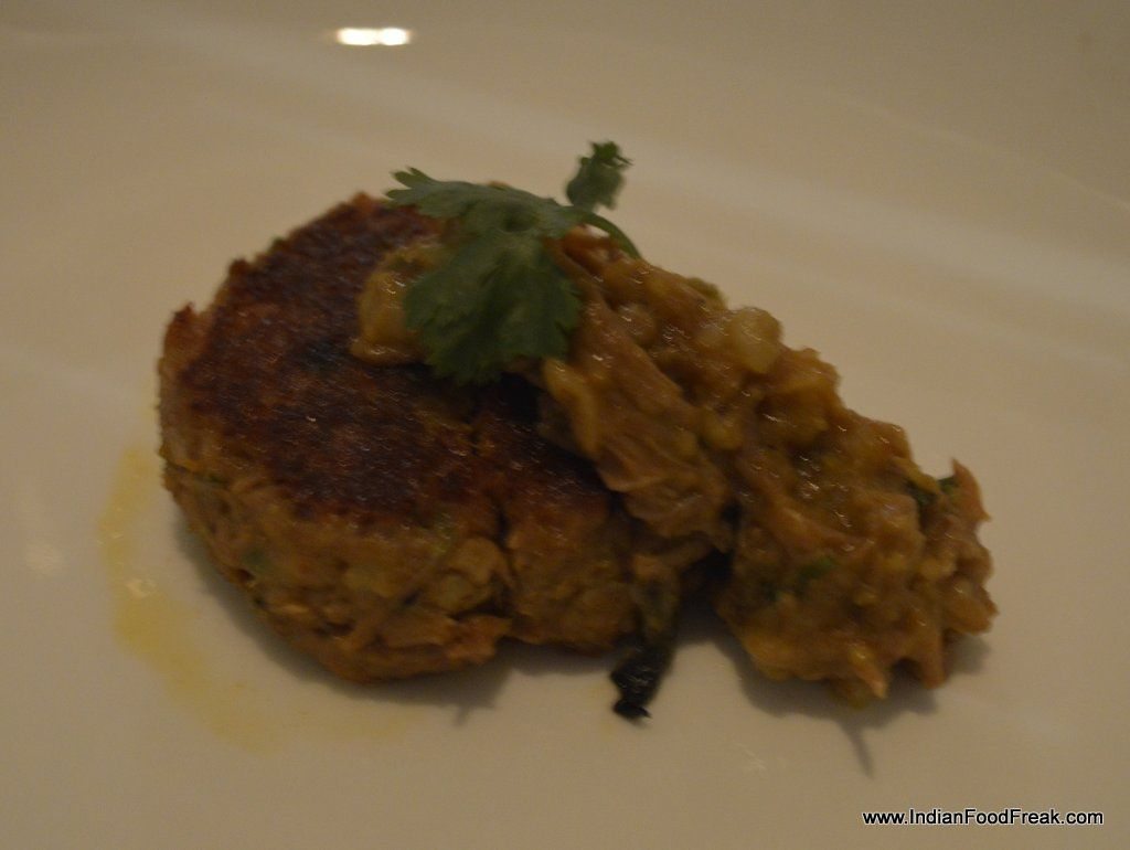 Crisp toasted bread topped with keema-kaleji done in tak-a-tak style and mutton chunks takes my heart. This Punjabi bruschetta makes me wonder why tak-a-tak mutton from Punjab is missing from Delhi’s culinary scene. Karara kekra (Crisp Crab cake) is from the current menu and is served with pickled cucumber and chilli mayo. I do try few dishes from my wife’s vegetarian menu and I realise that I have not been doing justice to the wonderful veg selection, so I decide to keep my focus on the non-veg sampling and mentally promise myself to come back for the veg fare some other day.