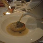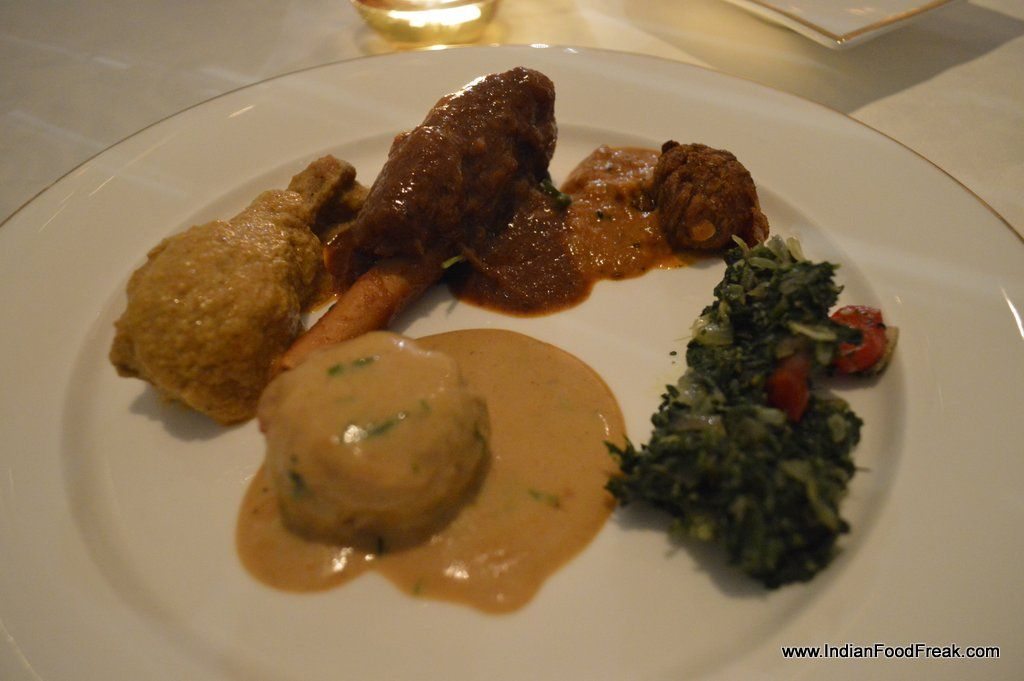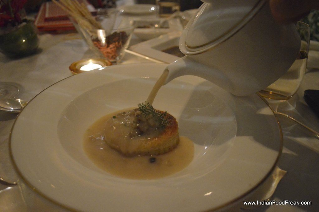 The second course is soup which is murgh malai shorba with pearl millet khichda. Khichda in delicious soup is such a creativity but the French Vol au vent (light flaky puff pastry) in which khichda is placed gets difficult to eat with spoon. I just focus on the soup and khichda that works pretty well for me.