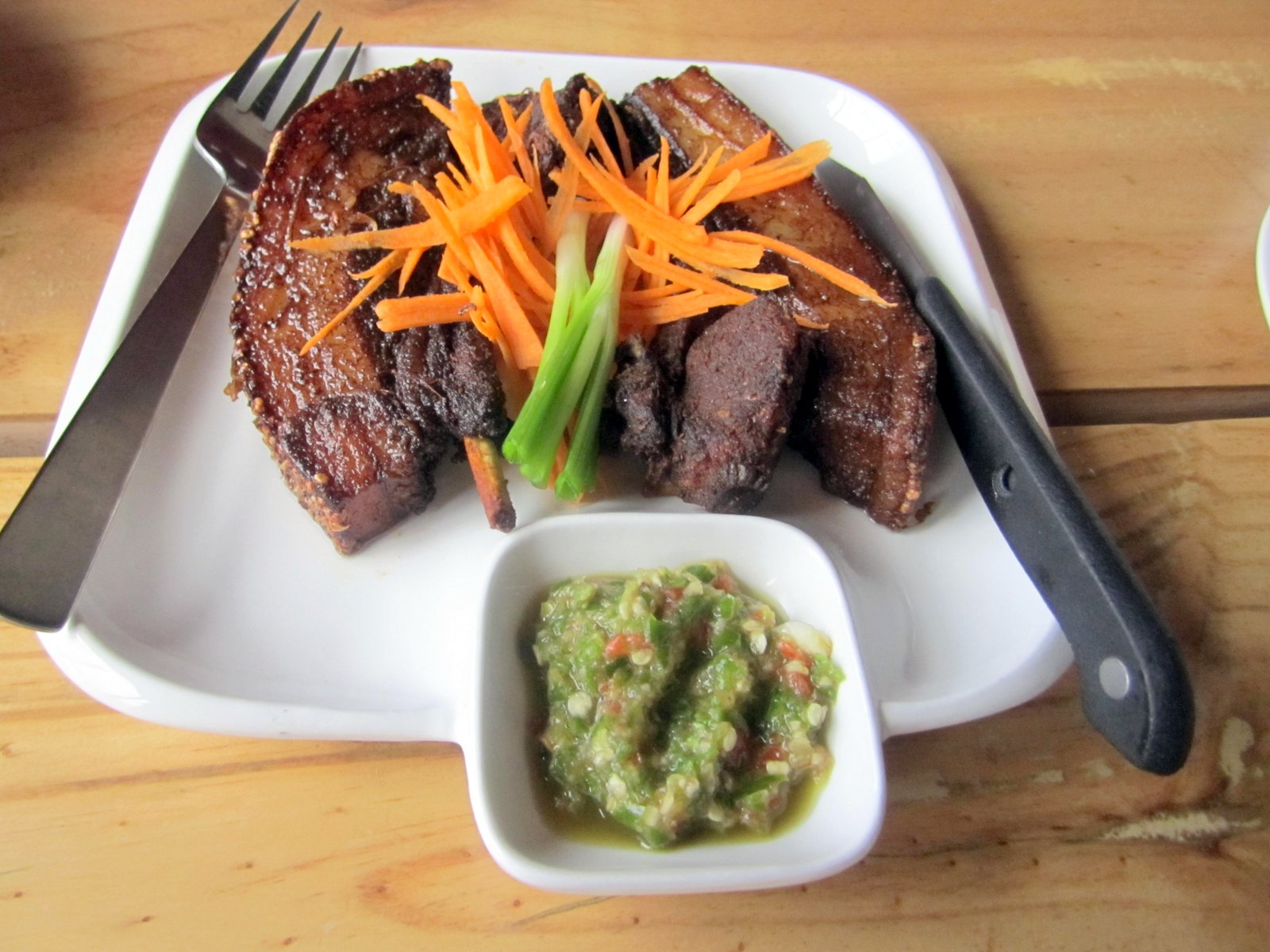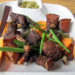 We settle into the community style restaurant where we sit cross legged with a low table in front of us. We start our session with the a dry Smoked Buff Salad (Rs 279) starter, with a delicious chilly hit. The dish is meaty, chewy, and has typical Naga flavours. Grilled Pork Ribs (Rs 349) is a dish most delightful. Here is perfectly grilled rib with oodles of fat, an entry point into porky heaven.