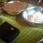 Dessert is a choice of ada pradhaman, a jaggery based payasam with a distinct delicious smoky taste and the Goan dessert, Dodol. The customary paan follows.