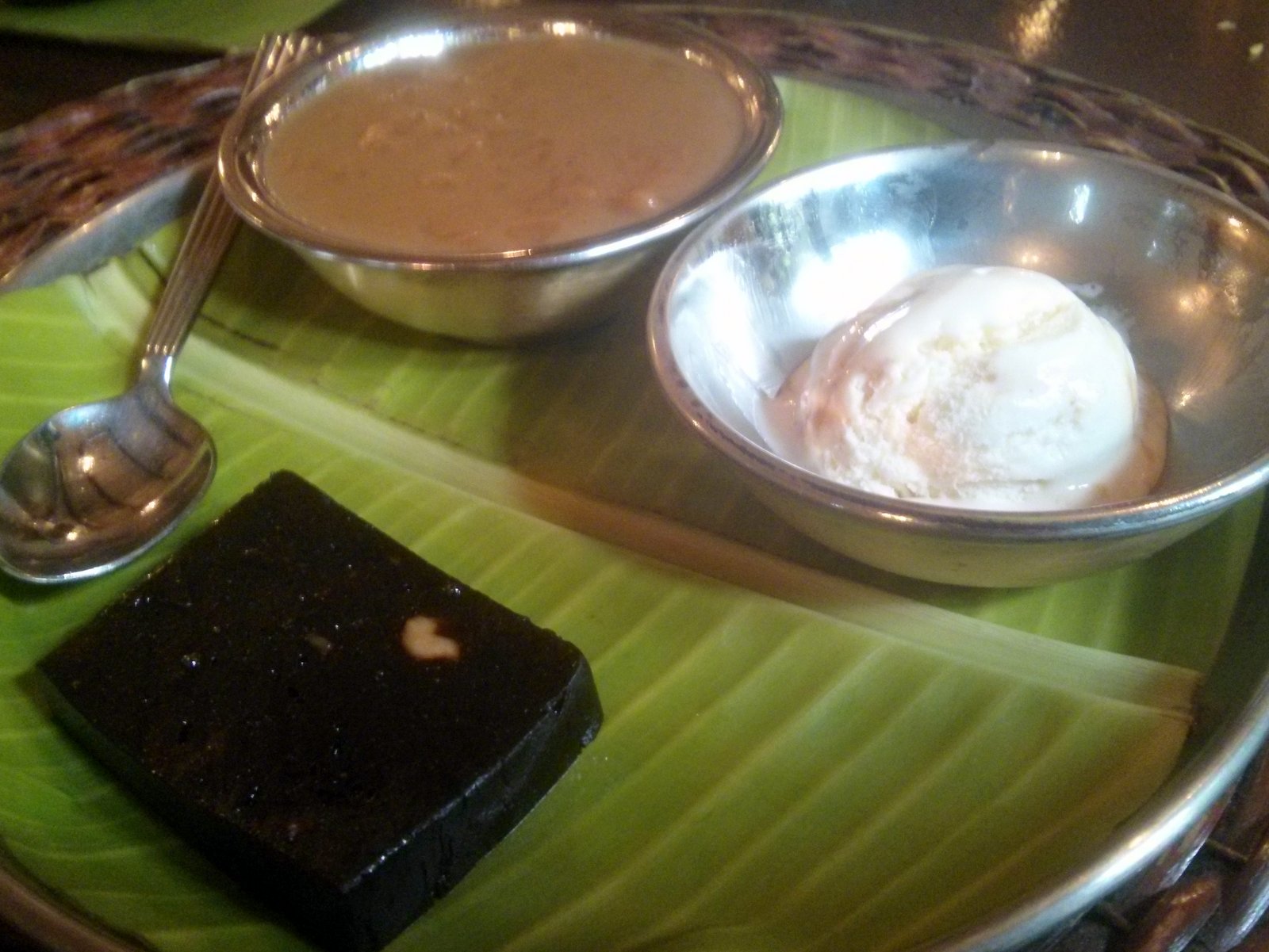 Dessert is a choice of ada pradhaman, a jaggery based payasam with a distinct delicious smoky taste and  the Goan dessert, Dodol. The customary paan follows.