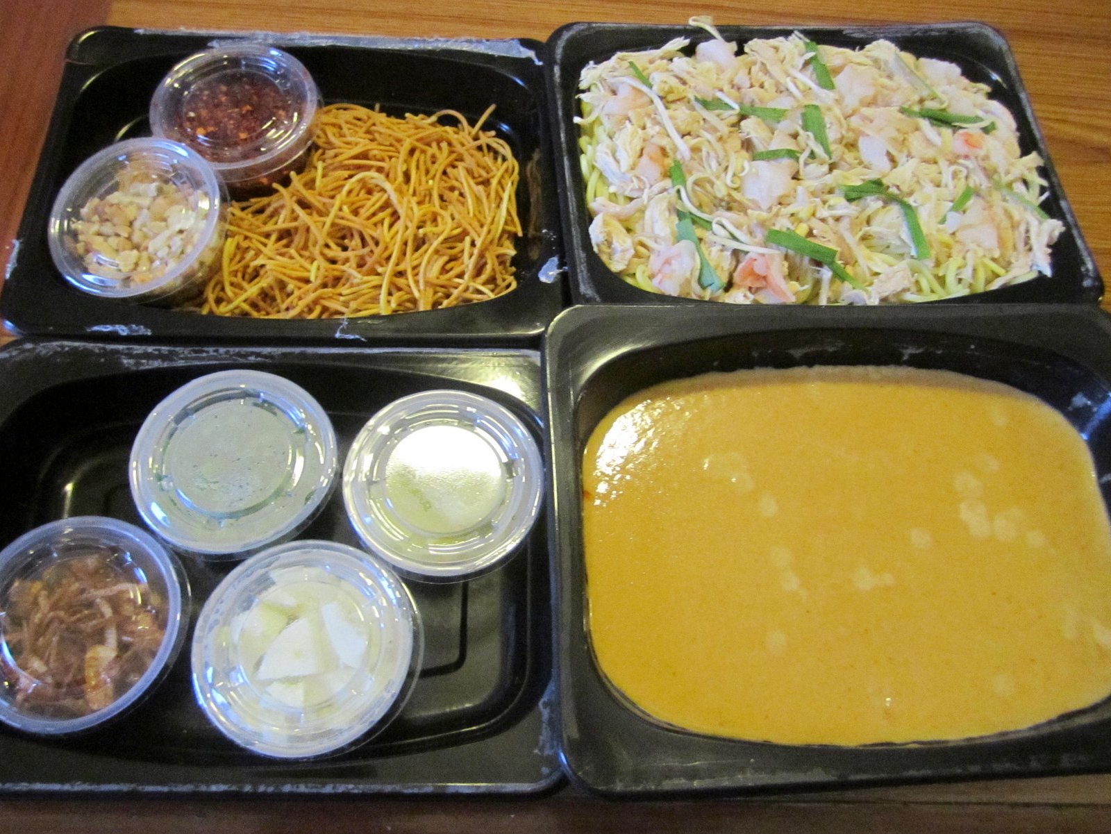 First with the good ones. The first dish I taste reminds me of our own good old fried idli. Spicy rice cakes (Rs 275) are rice cakes stir fried with chilli paste, chives & bean sprout and are quite a spicy tangy treat. The Asian Chicken Salad (Rs 295) is tasty. Haus khao suey (Rs 475) is a Burmese noodle soup, delivered in four boxes of soup, yellow noodles, garnishes & condiments, and is good. It is definitely a good dish to order.
