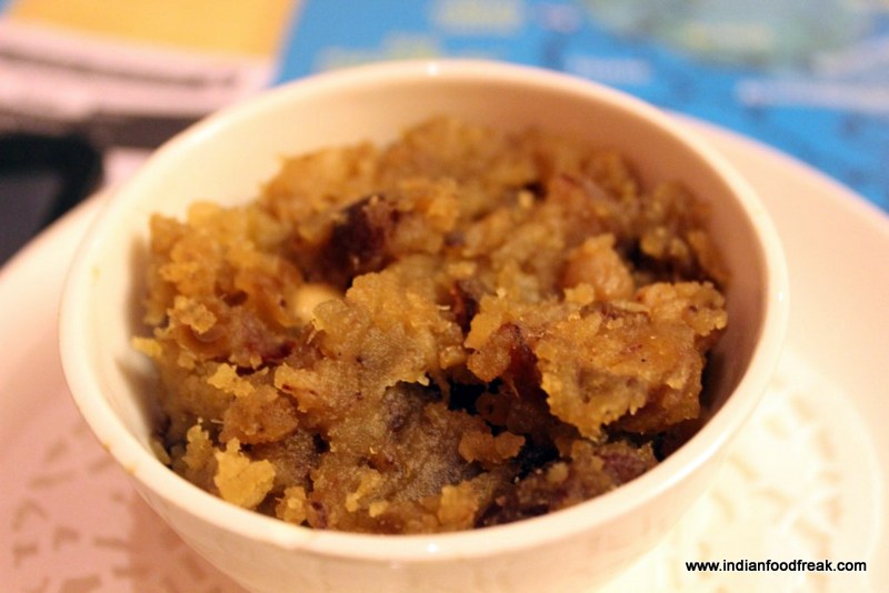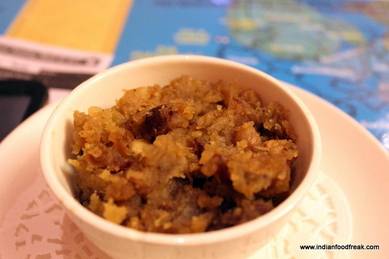The thali is well rounded off with the doodhi ka halwa which is full of nuts and raisins and reminded me of the lauki halwa which mom used to make for me as a child. The date and sweet potato halwa though well balanced in the sweetness quotient, was predictably heavy and dense.