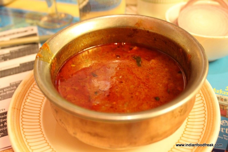 You could feel the cardamom in the white Pandhra rassa (Rs. 429) but I found the flavours to be a bit too mild. However when we added a dash of lemon, the whole dish took a new identity and went amazingly well with fresh hot Ambolis (Rs. 39).