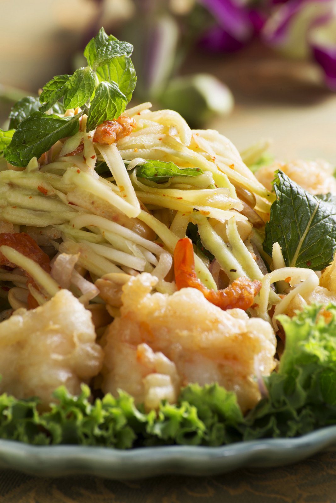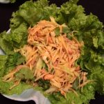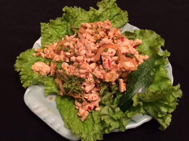 The first dish which Chef Veena Arora taught was the Yum Mamuang –Spicy and Tangy Raw Mango Salad, showing how to julienne raw mango without the help of any fancy peelers and just with a simple knife. In winters raw mango can be substituted with carrot or cucumber. She showed how a Thai salad is always eaten rolled up in a lettuce leaf so that one does not feel the spices.