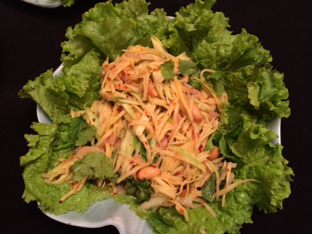 The first dish which Chef Veena Arora taught was the Yum Mamuang –Spicy and Tangy Raw Mango Salad, showing how to julienne raw mango without the help of any fancy peelers and just with a simple knife. In winters raw mango can be substituted with carrot or cucumber. She showed how a Thai salad is always eaten rolled up in a lettuce leaf so that one does not feel the spices.