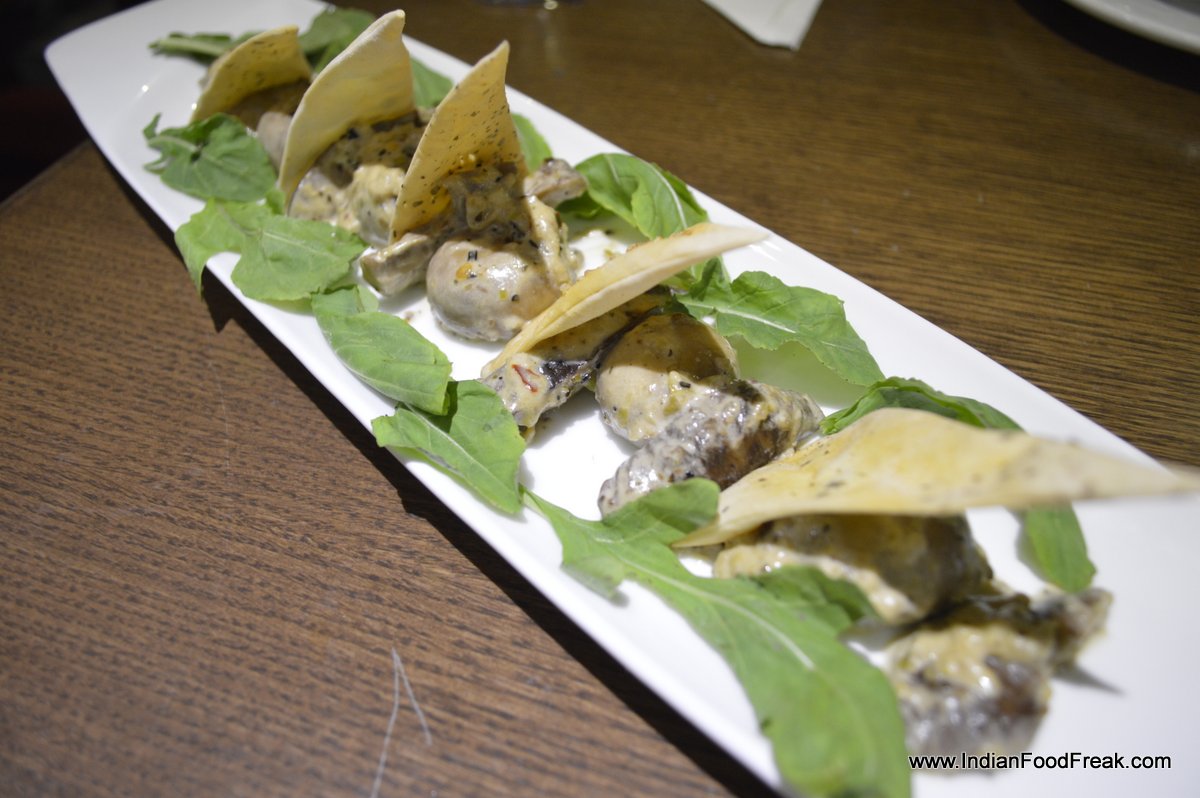 Roll Some (295) is a ricotta cheese and peppers filled in thin zucchini. We liked it, even more with the tobasco that we asked as our little experiment. However my favorite in vegetarian starters is the Two-Up (275), a combination of shitake and button mushroom tossed in garlic cream and served with parmesan lavash to provide a bite.