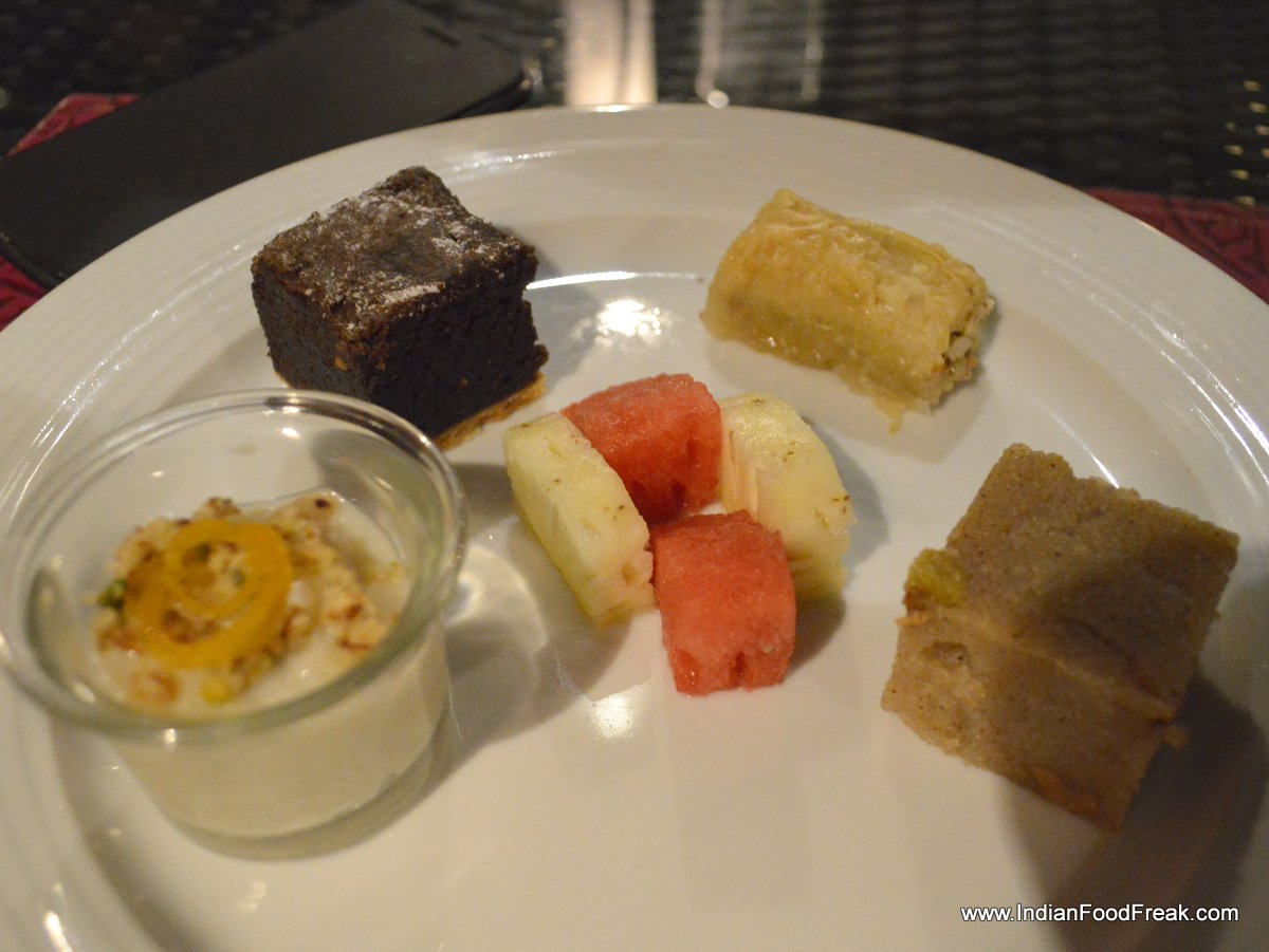 Mains – The New Zealand Grilled Lamb Chops were done rare and were bleeding on the plate – wish the chef had asked us how we liked our meat grilled. But these were more than made up by the New Zealand lamb cutlets which had a hidden cheese centre holding the soft cutlet together doing the same job our chana dal does in shaami kebabs as also the Jumbo Cochin Grilled Prawns flown in daily from Cochin.