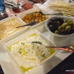 In apparently true Greek tradition, we started with Greek wine (but no Ouzo!) and a cold mezze platter (small savory dishes to be enjoyed with wine before the main course) served with breads. The platter had Greek Olives, Tzatziki (Greek yogurt with cucumber, garlic, chili and fresh mint) which was refreshing, Revithia (chickpeas with herbs, olive oil and lemon) which was essentially flavoured, boiled chickpeas and Htipiti (Greek cheese dip with roasted peppers and chili) which was the best out of the whole lot.